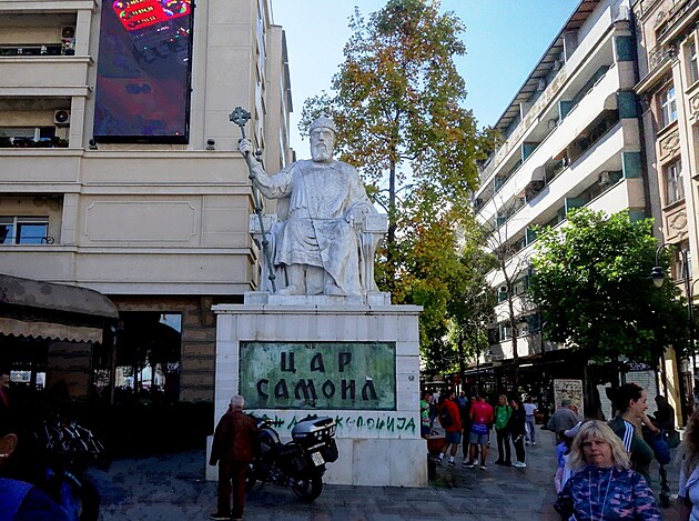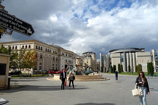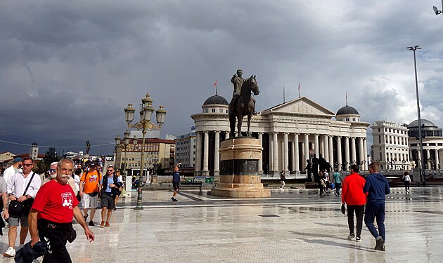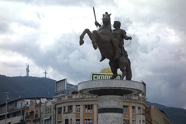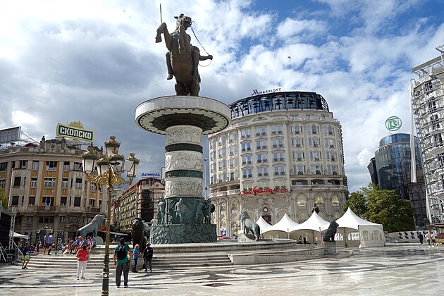 Srdce mesta – Námestie Macedónska. V jeho strede je 22 metrov vysoká socha „Jazdca na koni“. V skutočnosti ide o sochu Alexandra Veľkého a jeho koňa Bukefala. Z politických dôvodov takto nemôže byť oficiálne pomenovaná, lebo územie Macedónska zasahovalo aj do dnešného Bulharska, severného Grécka i ďalších okolitých štátov a jeho centrom bola grécka Solún (Thessaloniky). Aj preto, na protesty Grécka, sa štát Macedónsko v r. 2018 premenoval na Republiku Severné Macedónsko. Má 1,8 milióna obyvateľov a rozlohu 25 713 km² (cca polka Slovenska).
