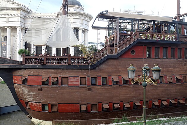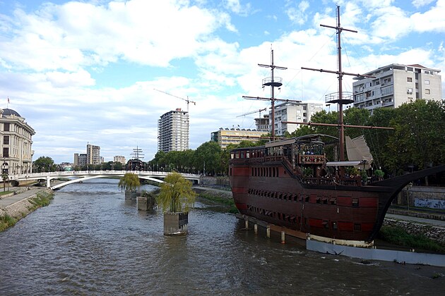 Je zjavné, že na tak malej rieke možu plávať maximálne tak malé člny. Všimnite si aj kvetináče uprostred rieky. Balkánske Las Vegas..., či mesto gýču... , aj preto patria medzi časté pomenovania novo postaveného centra Skopje zničeného zemetrasením z r. 1963.