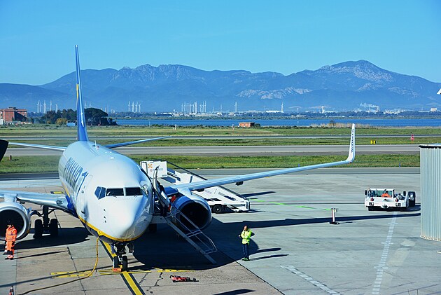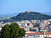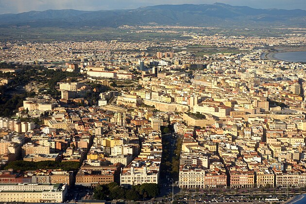 Pohľad z lietadla na časť centra metropoly Sardínie tesne pred pristátím.