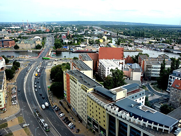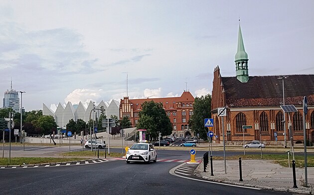 Vľavo je budova Štetínskej filharmónie z r. 2015, ktorá získala prestížne architektonické ocenenie - najkrajšia moderná stavba EÚ roku, a vpravo je kostol sv. Petra a Pavla.