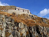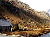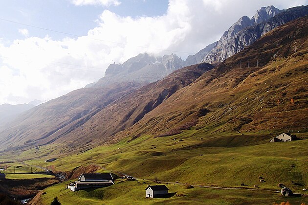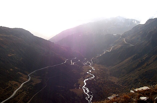 Serpentíny k horskému prechodu Furka (2.431 m) zo spodu - smer pokračujúci z údolia Rhôny ďalej na východ. Na fotografii vpravo od stredu vidieť horskú chatu, ktorú som fotil vyššie. Z tohto údolia je to už len na skok k známej trojici Bernských Álp: Eiger, Mních (Monch) a Panne (Jungfrau) (4.158 m).