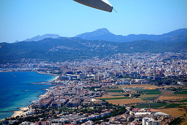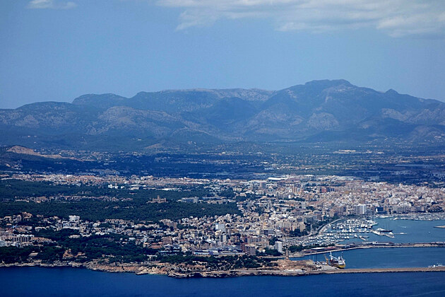 Sierra de Tramuntana nad Palmou, resp. jej západnou časťou. Napravo vidieť prístav, nad ním štvrť Santa Catalina, a od stredu vľavo šikmo dolu vidieť uprostred mestského lesoparku, na jeho vrchole, hrad Bellver, zo 14. stor. a jeden z mála kruhových hradov v Európe.