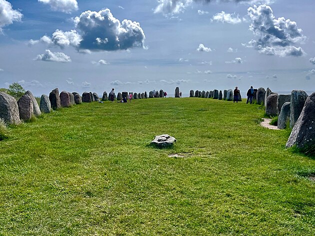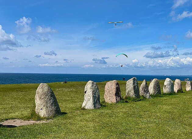 Pak už pokračujeme autem podél pobřeží do vesničky Kåseberga a pěšky po turistické značce k obrovské megalitické kamenné lodi Ales stenar. Skládá se z 59 kamenů, z nichž každý váží přibližně 5 tun, a byl postaven ve někdy v letech 540 až 790n.l. délka je úctyhodných 67m a šířka asi 19m. Pěkně tu fouká a nad pobřežím poletují rogalisté. Krásný pohled! Jen mě zaráží, jak se občas turisté snaží vylézt na některý z megalitů. Bylo by škoda tu krásu poničit. Cestou k autu nás chytne prní, ale ne poslední, průtrž mračen.