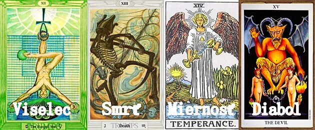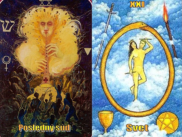 Znázornenie čísla osem v Crowleyho tarote. Keď sa 8 prevráti nabok, vznikne znak nekonečna (nekonečného cyklu zrodenia a smrti). Číslo osem je číslom Saturna.