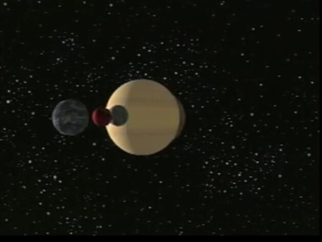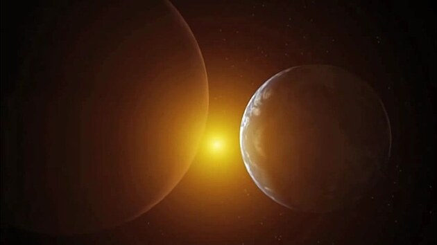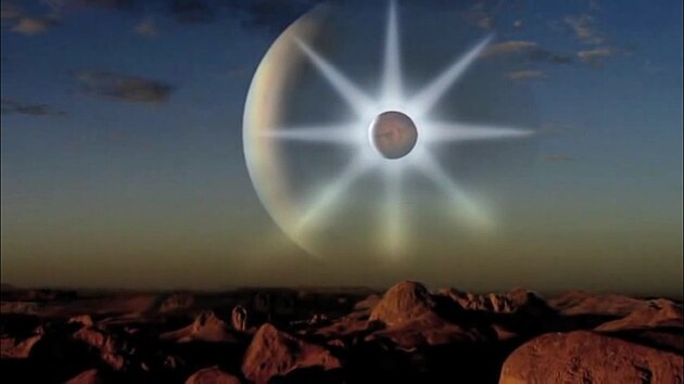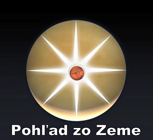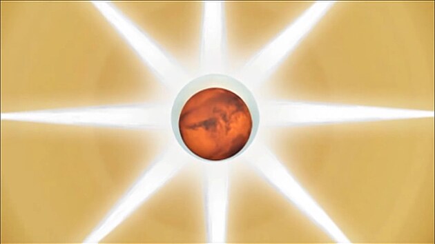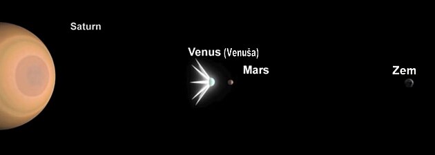 Pred centrálnou 'hviezdou' Venušou sa nachádzala menšia, temnejšia červenkastá guľa - planéta Mars.