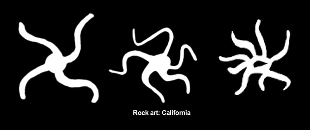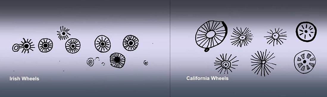 Piktografické kozmické kolesá sú znázornené aj v Írsku a Kalifornii, kde máme iba menšie rozdiely. Veľký kruh na kolese nie je vždy prítomný. Zostáva však malá centrálna hviezda a lúče z nej vychádzajúce. Umelci umiestnili niekedy malú čiernu sféru celkom dolu pod centrálnu hviezdu. Umiestnenie nie je náhodné. Tieto formy na oblohe reprezentovali planéty starovekých uctievačov oblohy v istej konfigurácii.