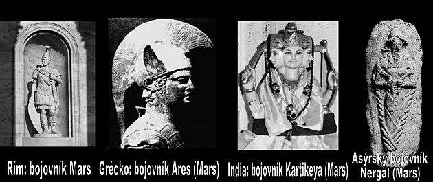 Mars bol mýtický bojovník, mužské 'Srdce sŕdc', 'Dieťa v lone', 'Zornička v oku', 'Os kozmického kolesa'. Bol to zabijak drakov a víťaz nad 'monštrami chaosu'. V Ríme bol známy ako bojovník 'Mars', v Grécku ako bojovník 'Ares', v Indii ako 'Kartikeya', bol to asýrsky bojovník 'Nergal'. Mal množstvo mien a spomína ho každá stará kultúra.