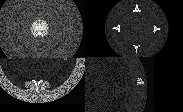 Aztécky kalendár ako zložité koleso obsahuje v jeho centre hrdinu-bojovníka, štyri explozívne lúče životnej energie, ohraničujúceho, často dvojhlavého hada, a identitu tohto hada predstavujúcu božský oheň.