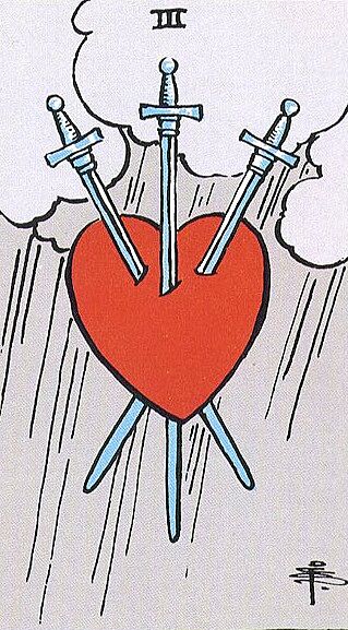Meče III: Na zamračenej oblohe sa vznáša červené srdce, ktoré je symetricky prepichnuté tromi kovovými mečmi. Nad srdcom visia tri oblaky, z ktorých prší. Prepichnuté srdce predstavuje citovú bolesť spôsobenú pichľavými myšlienkami. Môže ísť o milenecký trojuholník, ktorého vznik bolesť spôsobil. Daždivé počasie predstavuje pochmúrnosť, smútok. Bolesť v srdci Fratera Saepesa stále neprešla. Znovu sa objavila, aby mu dala najavo, že je jej otrokom.