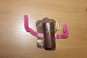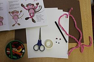 K výrobě opičky jsme použili hnědý tvrdý karton, bílý výkres (vybarvili jsme ho růžovou voskovkou), nůžky, lepidlo, lepicí pásku, černý fix, nalepovací očička a plyšové drátky.