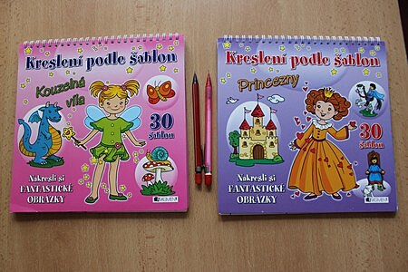 Kreslení podle šablon – Princezny a Kreslení podle šablon – Kouzelná víla. V knížečkách s kroužkovou vazbou najdete v přední části 4 listy z umělé hmoty, do nichž jsou vyraženy šablonky. Celkem jich je v každé knize 30 a jsou různých velikostí. V „Princeznách“ na malé malířky čekají fialové šablonky princezen, ptáčků, květin i tajemné truhly. V „Kouzelné víle“ si mohou vyzkoušet růžové šablonky víl, kouzelných hůlek nebo třeba veverky. Všechny šablony lze libovolně kombinovat a vytvořit tak pokaždé jiný obrázek.