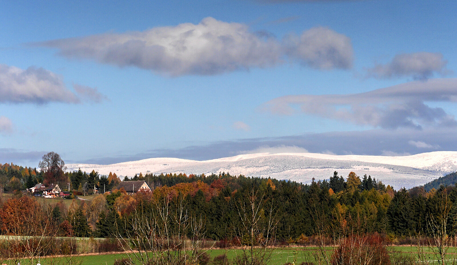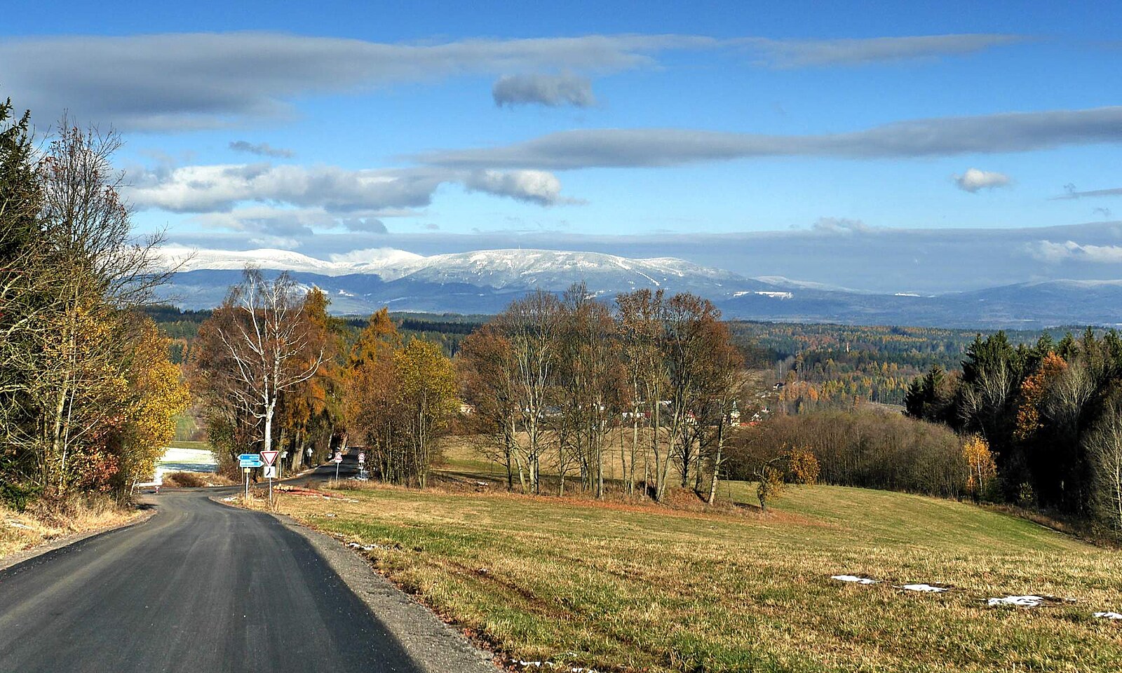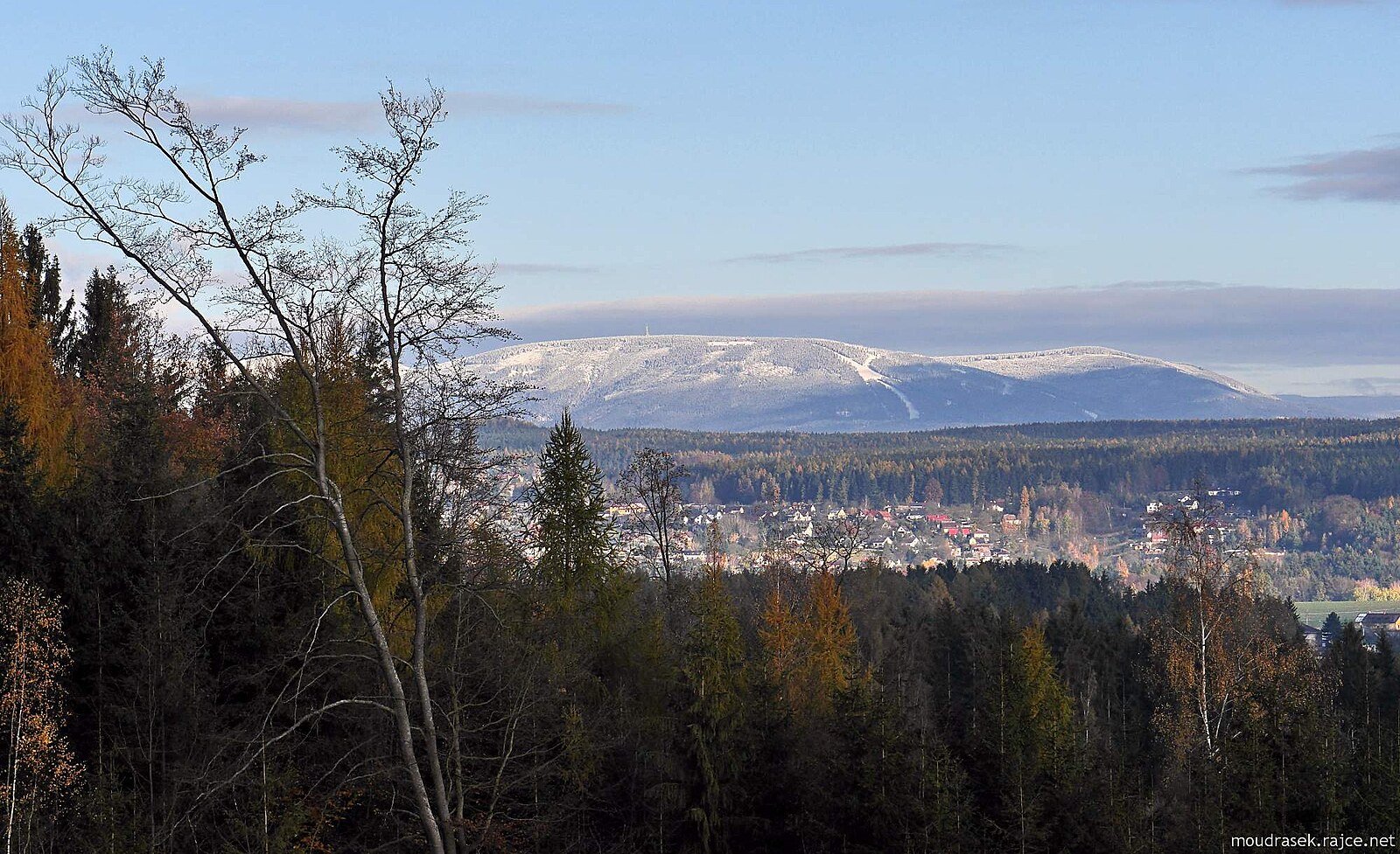 Výhled ze Zvičiny - vrcholky zasněžených Krkonoš v mracích