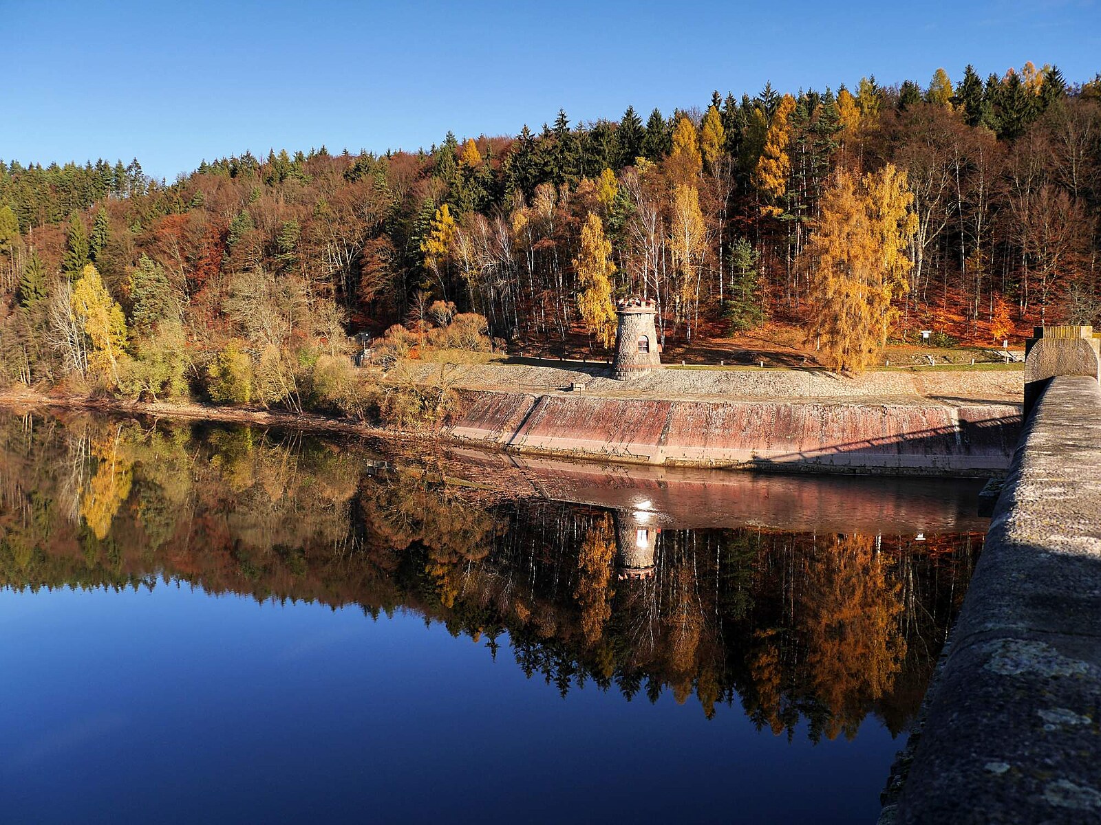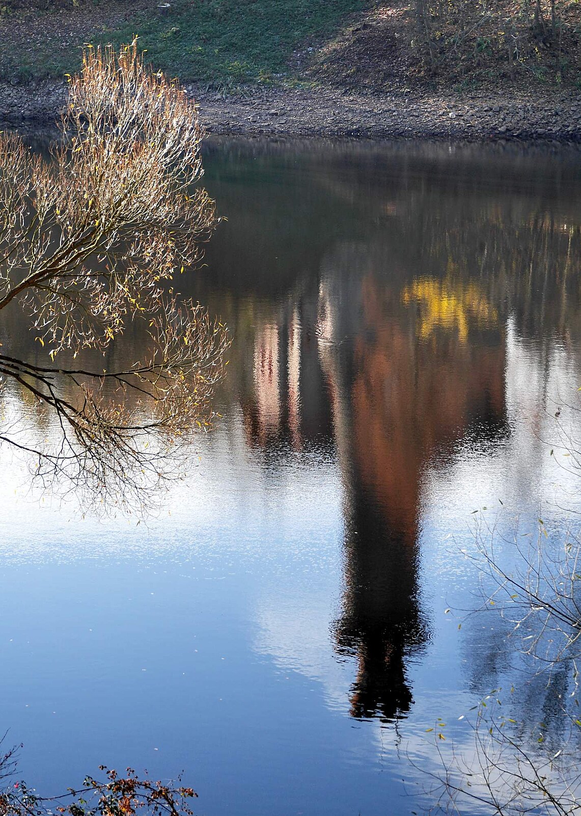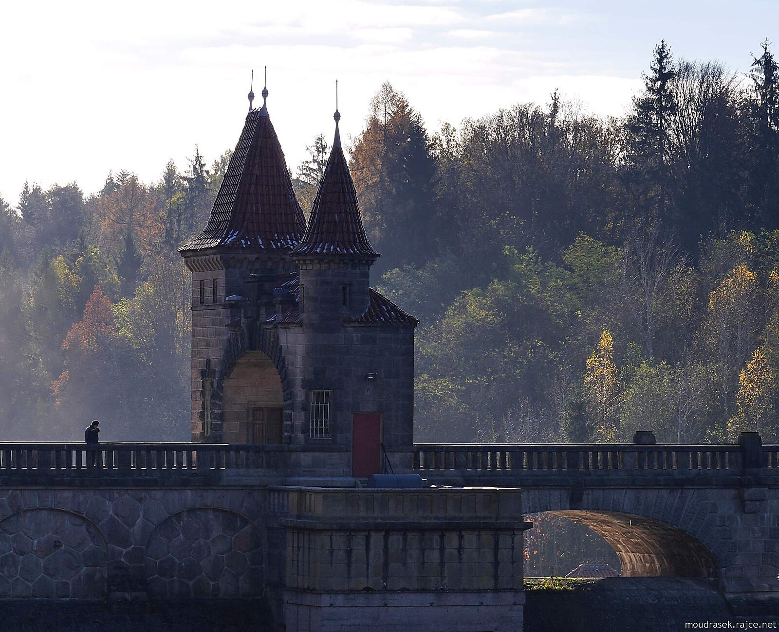 Pohled na hráz přes nádrž; odrazy věžiček na hladině - přiblíženo