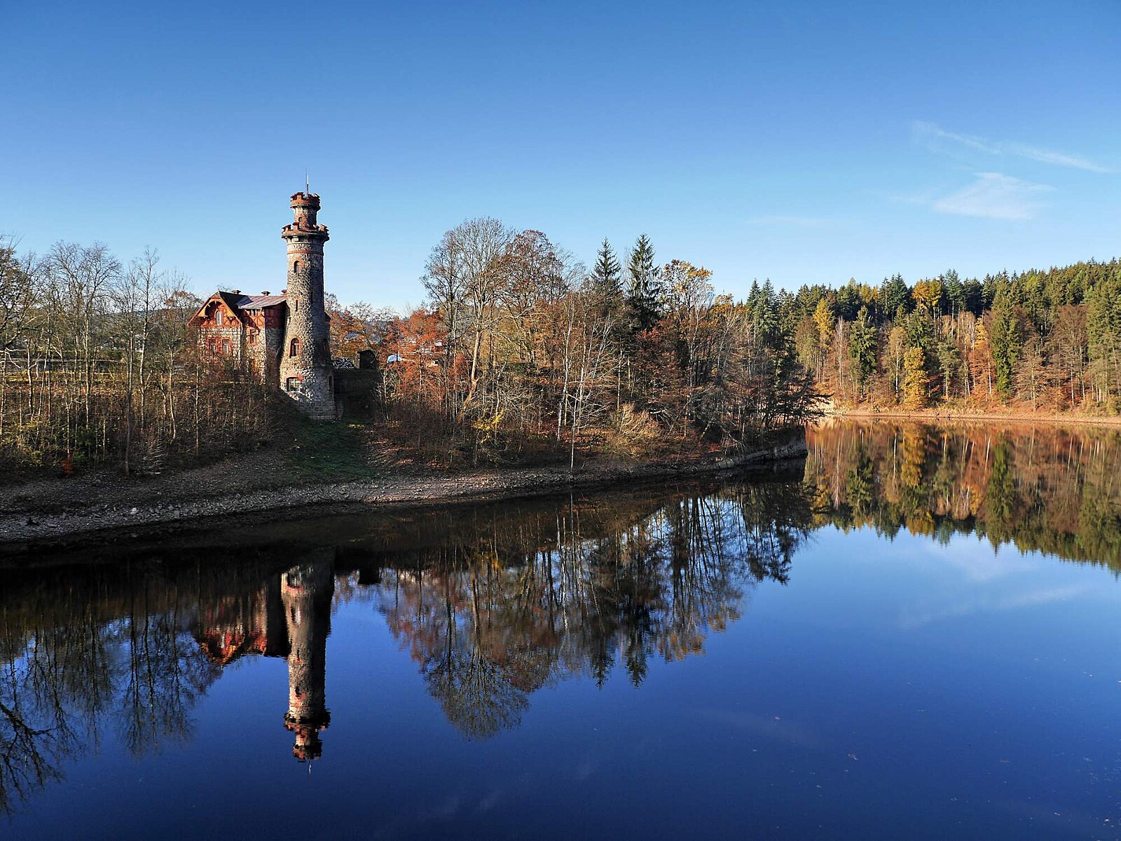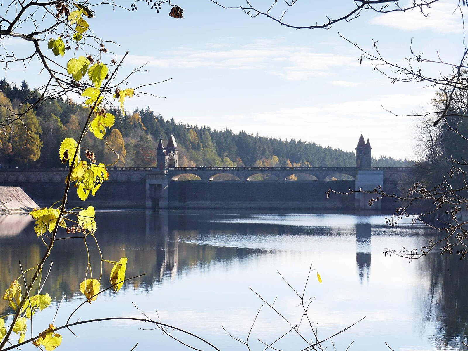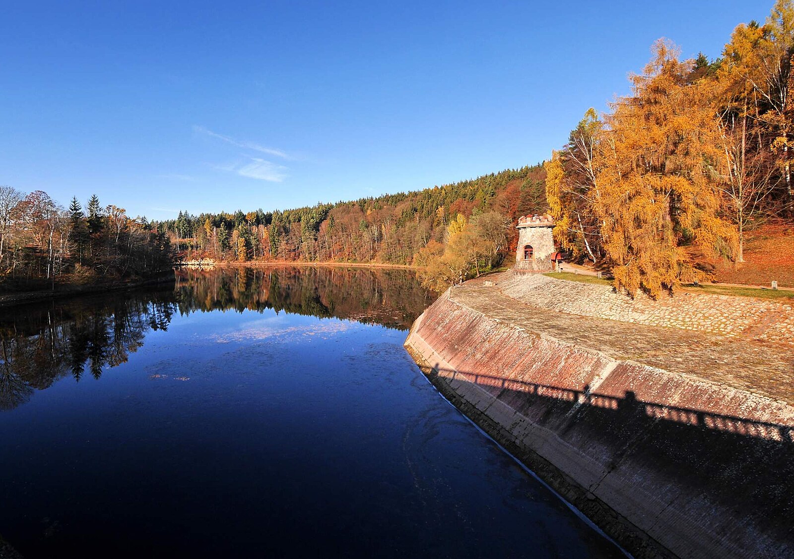 Pohled na hráz přes nádrž; odrazy věžiček na hladině - přiblíženo