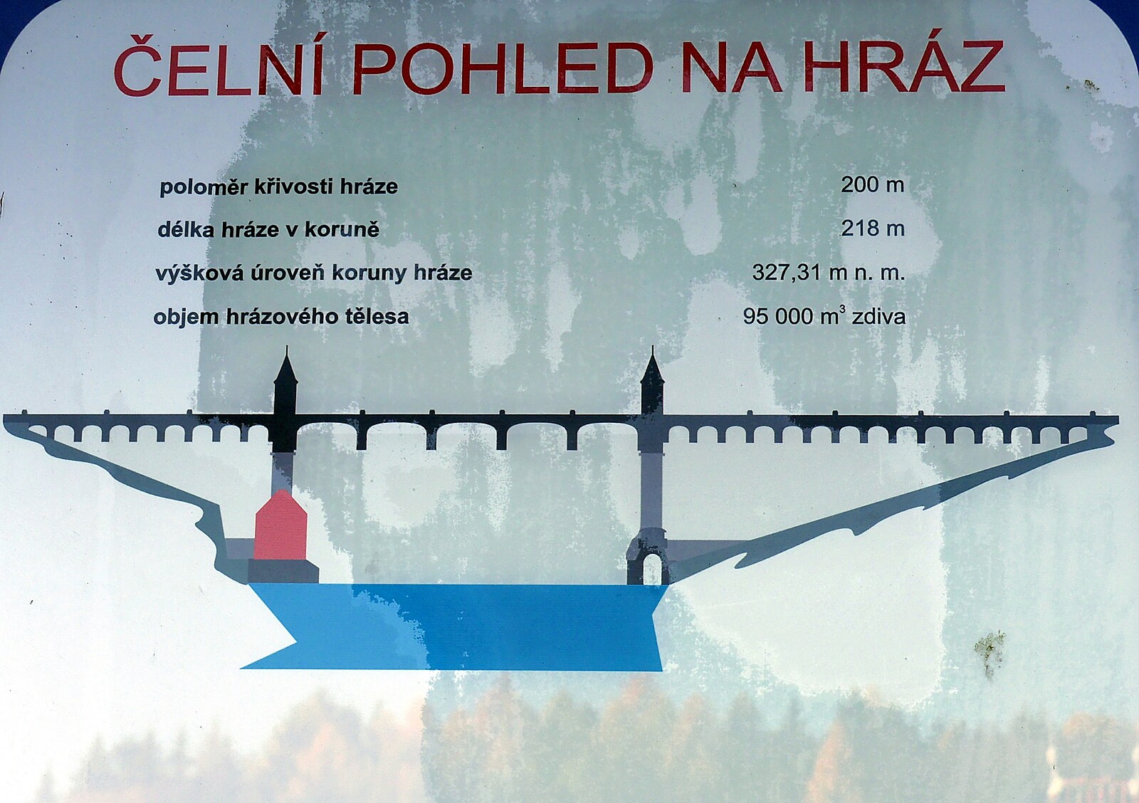 Čelní pohled na hráz - foto části informační tabule u přehrady