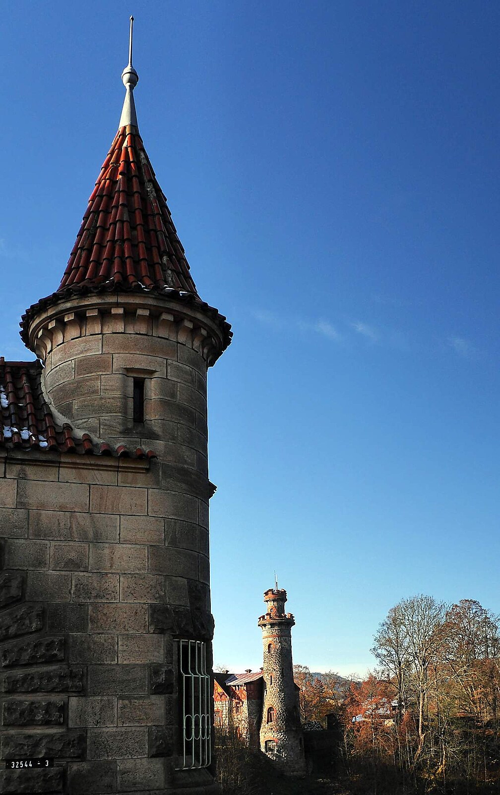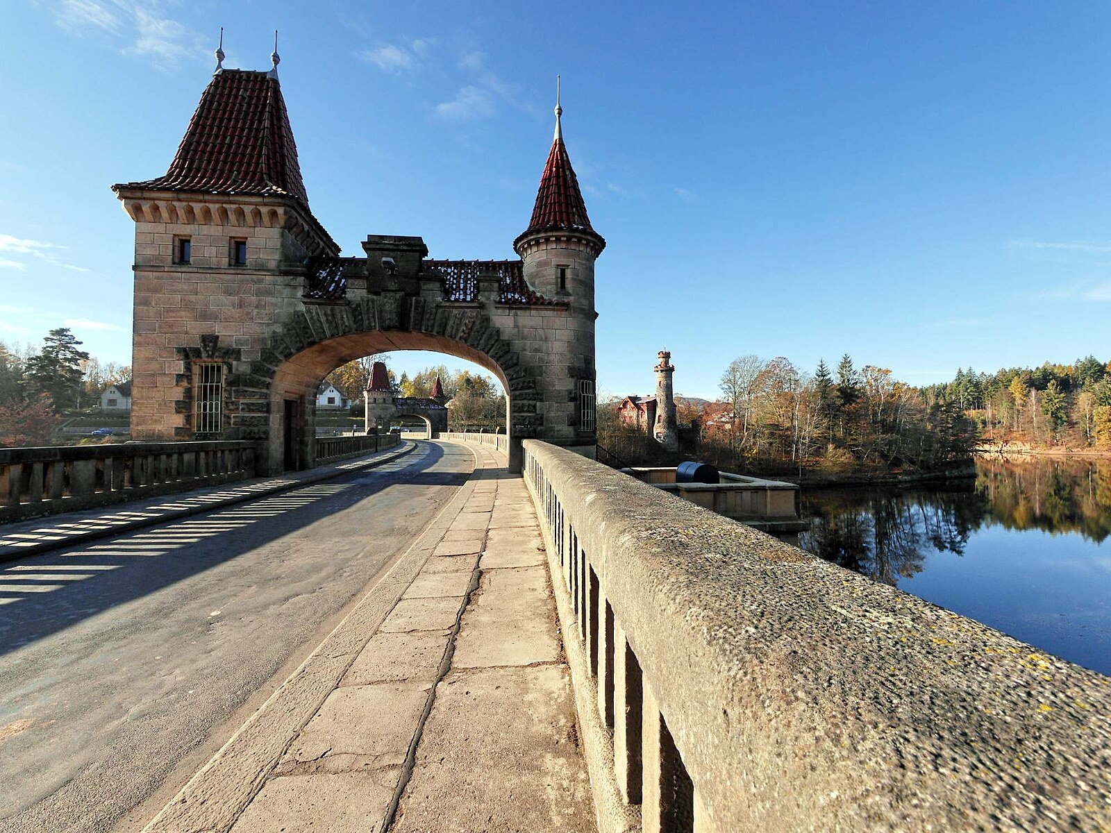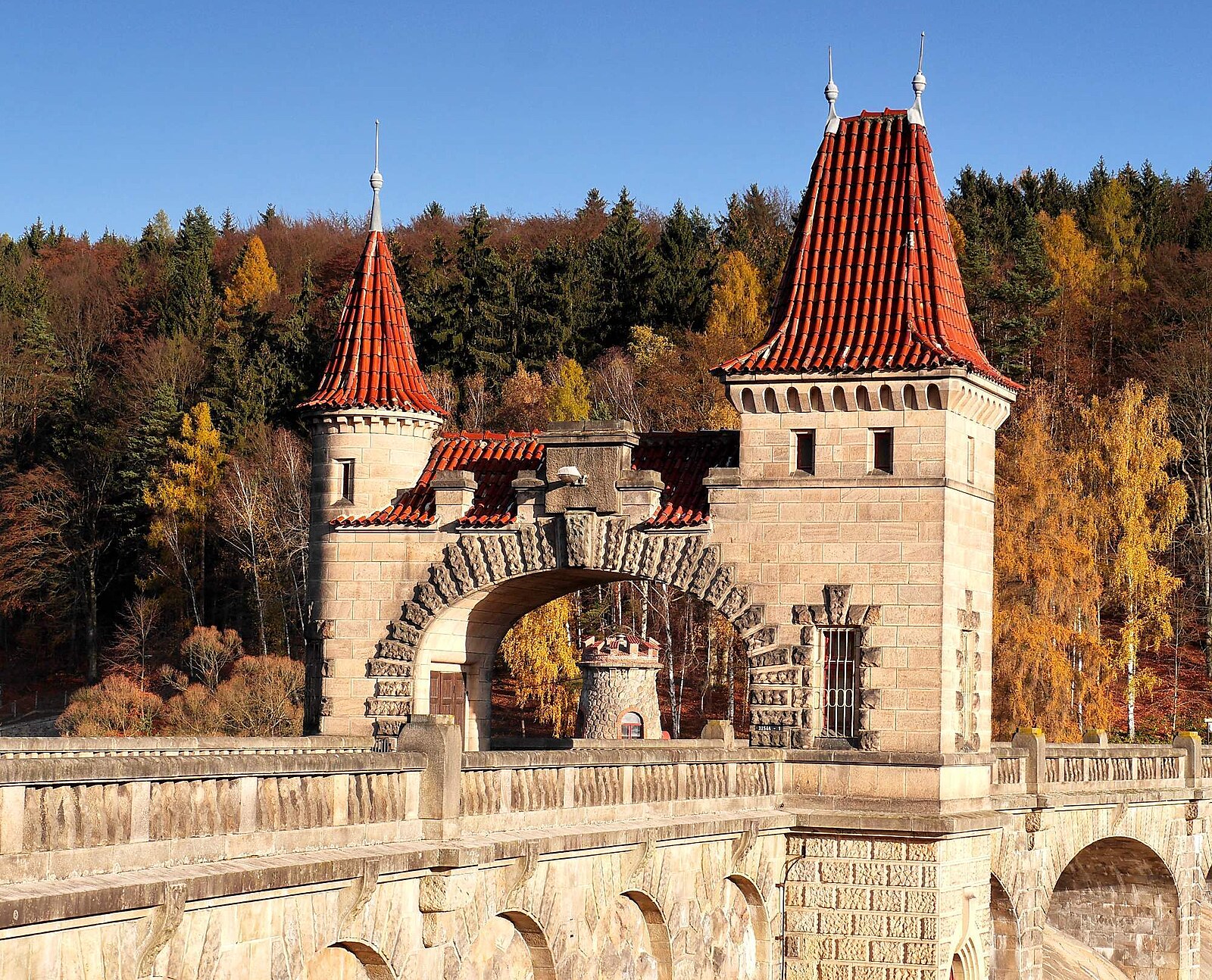 Romantické věžičky hráze, v průzoru obloukem levá šoupátková věž