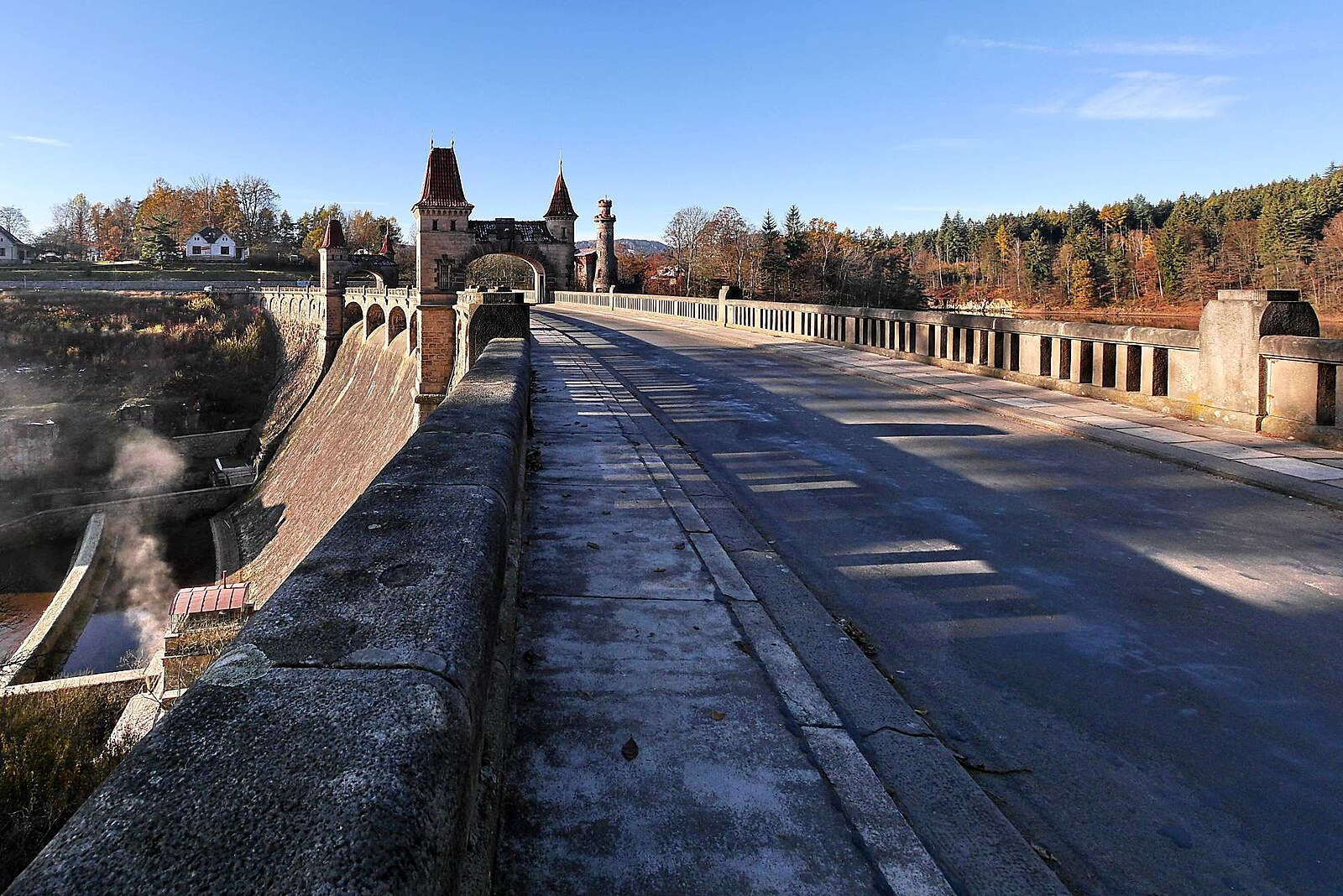 Věžičky hráze v protisvětle působí poněkud ponuře