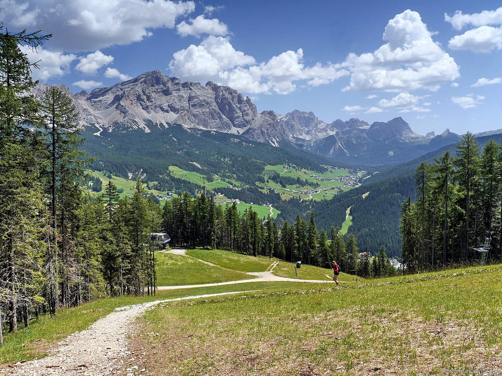 Pěšina vede dolů lesem a pak po sjezdovce s výhledem na údolí vedoucí k průsmyku Valparola