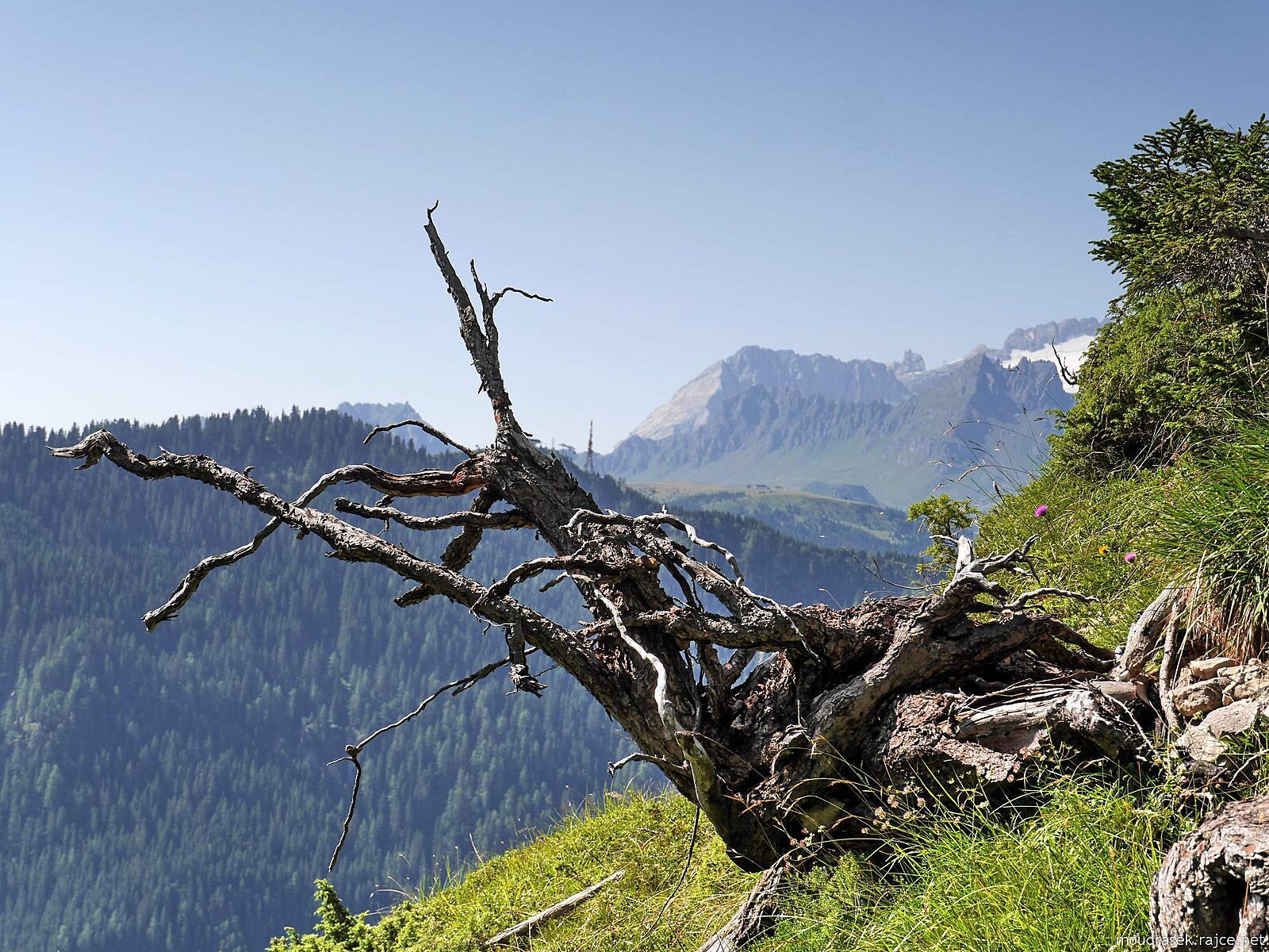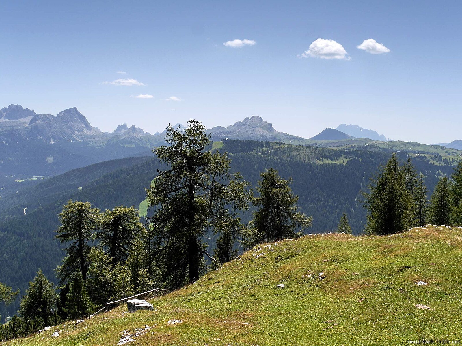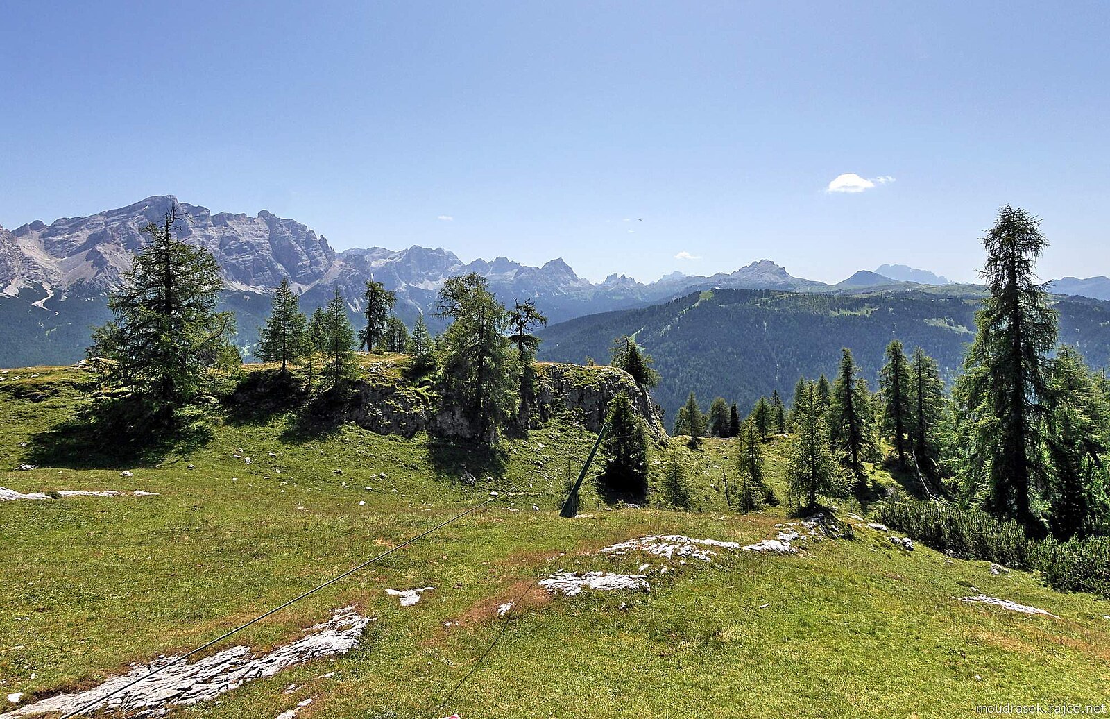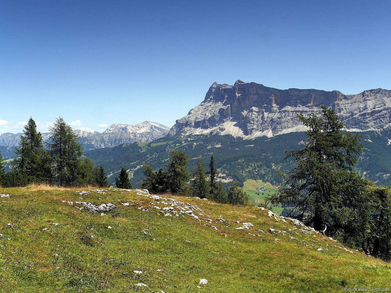 Výhled na Lagazuoi, Sass Stria, Setsass a Col di Lana, světlé skvrny v trávě jsou suché kravince