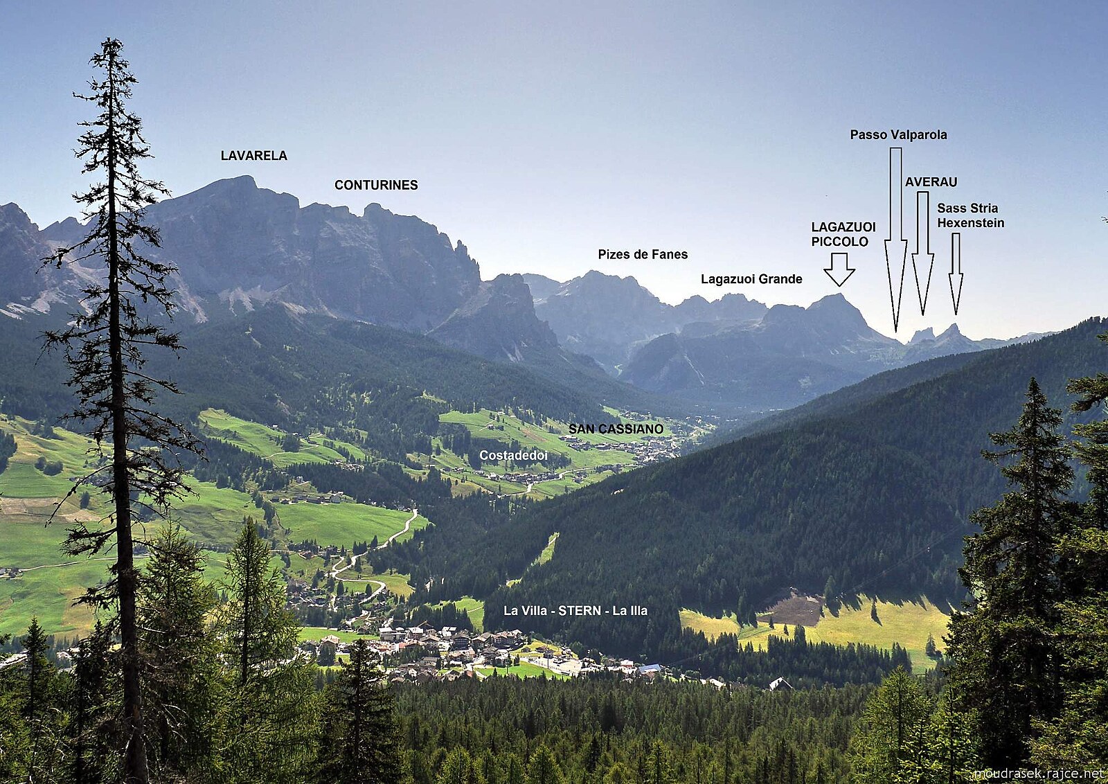 Výhled na Stern/La Villa/La Ila, nad ním Lavarela a Conturines, vpravo vzaru Lagazuoi Piccolo