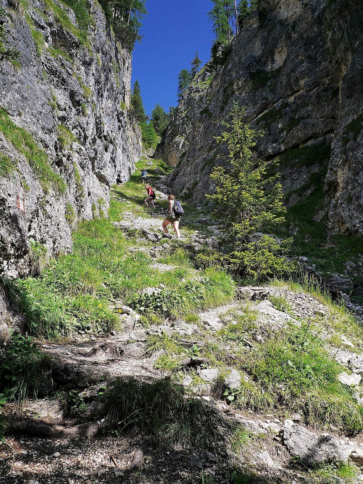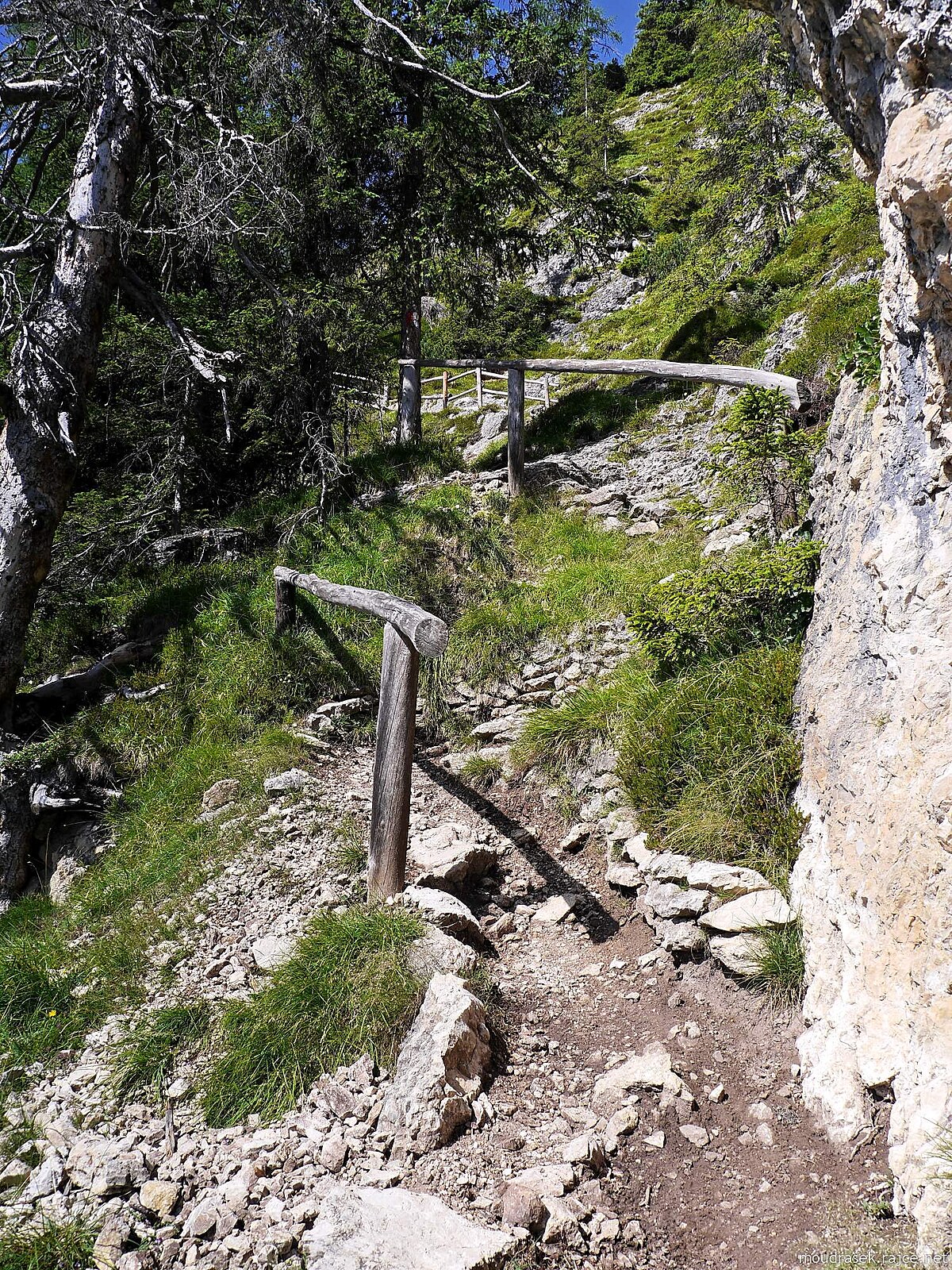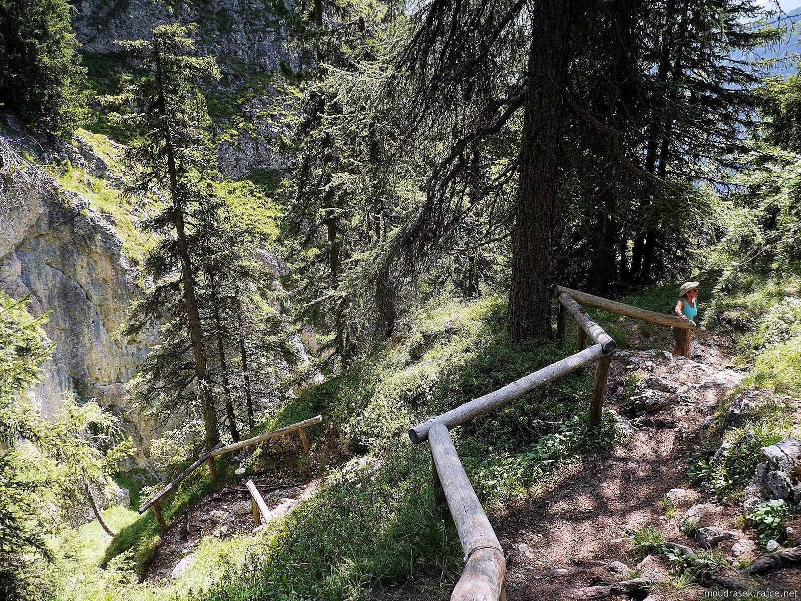 Pěšina se těsně tulí ke skalní stěně Gherdenacia