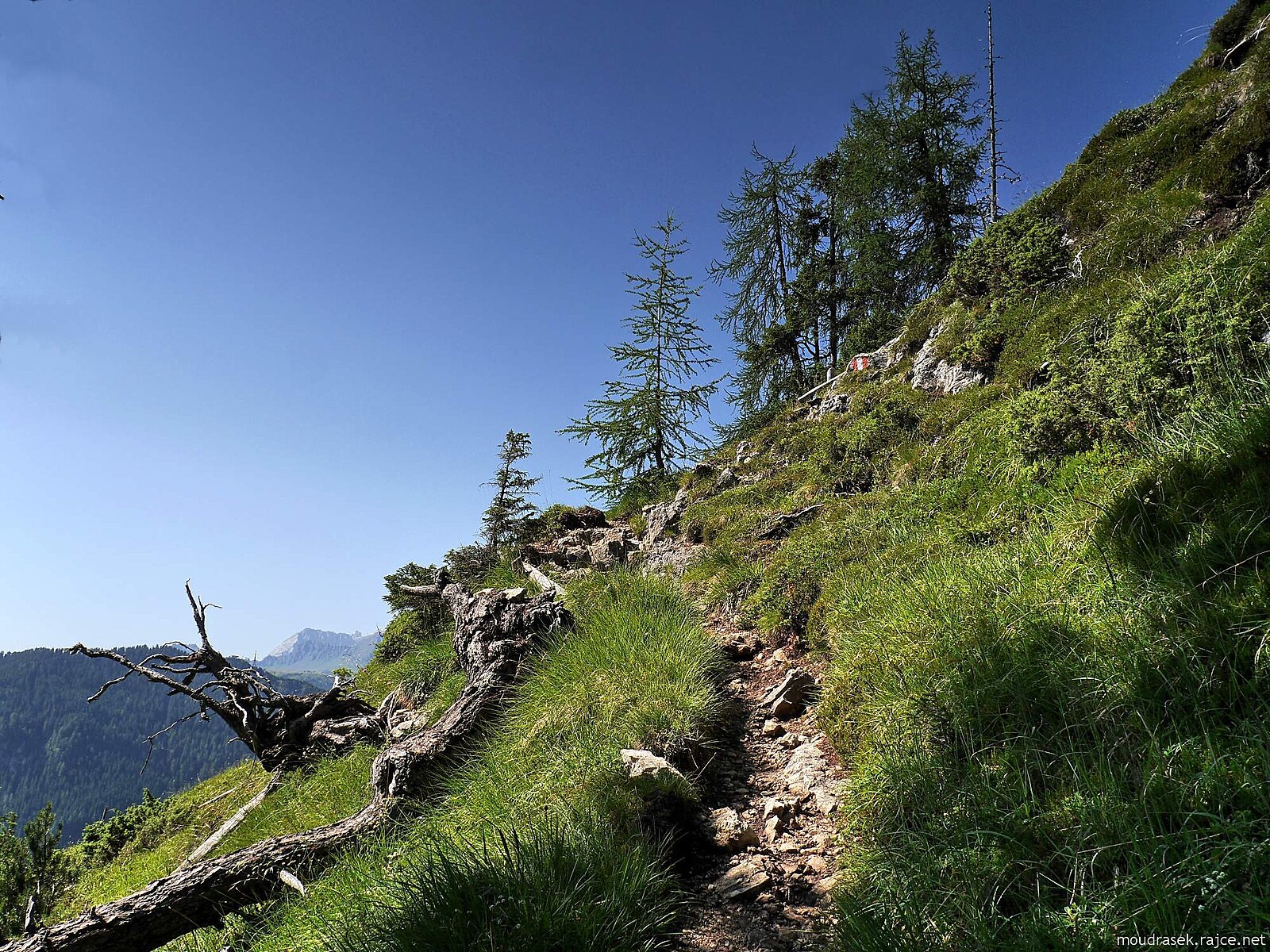 Stezka č.5 klesající z pastviny u boudy Gardenacia dolů do údolí je klikatá