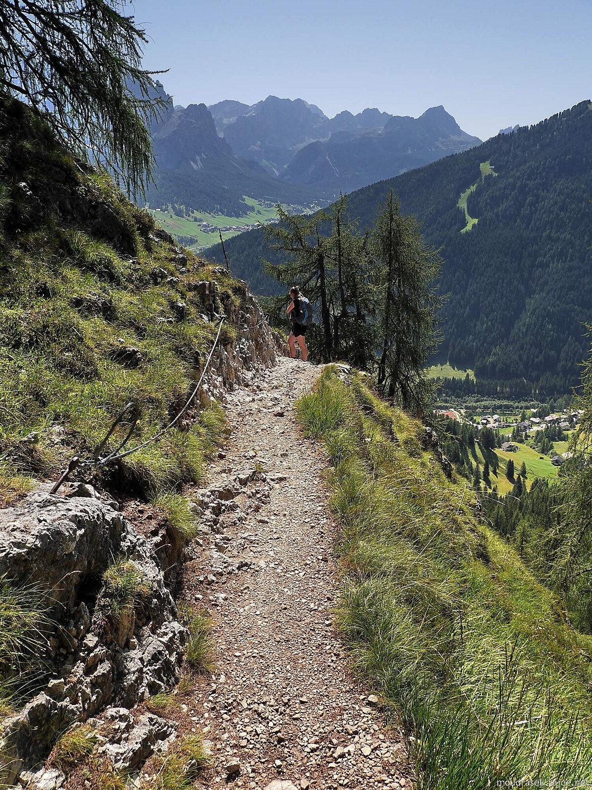 Stezka č.11, pohled zpět, v pozadí Lagazuoi a Pizes de Fanes, u pěšinky ocelové lano, dole Funtanacia