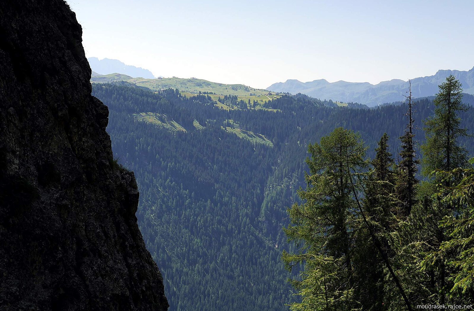 Výhled z průrvy na louky Pralongia