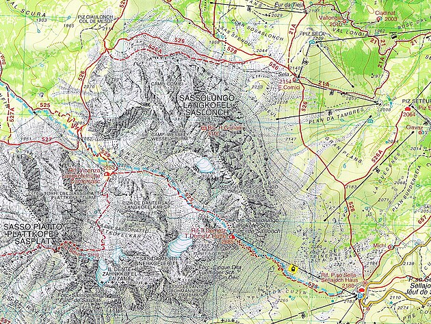 Chodníček pod boudou Vicenza/ Langkofelhütte/ Dantersasc sice opět překonává strmé klesání, je však přiměřeně široký a dobře schůdný. Ještě před tím, než se začíná pořádně klikatit, jsme z něj ovšem odbočili vpravo, po značené pěšině č.526. Ta krátce za rozcestím (2 085 m n.m.) pokračuje dál na sever téměř po vrstevnici a nabízí půvabný výhled na Alpe di Siussi, nahlodaný masiv Schlern/Sciliar, část Catinaccia známou jako Denti di Terra Rossa a kvetoucí louky Seiser Alm. Při troše štěstí tu můžete mezi kamením u cesty najít drůzy krystalů růžového dolomitu. Zhruba po kilometru pohodlné chůze následuje krátké stoupání k rozcestníku (2 114 m n.m.), kde se trasa dělí na 526, 526A a 526B (ZDE - odkaz na leteckou mapu).