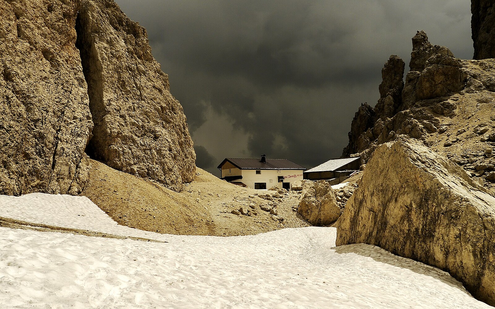 Když se do Forcella Sassolungo blíží bouřka, ale ještě svítí slunce