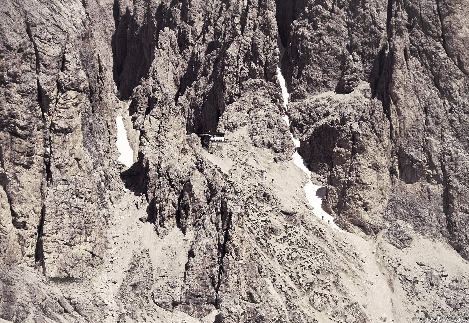 Bouda Toniho Demetze v úzké rozsedlině a finální část přístupové stezky 525 z Passo Sella, záběz z Col Rodela