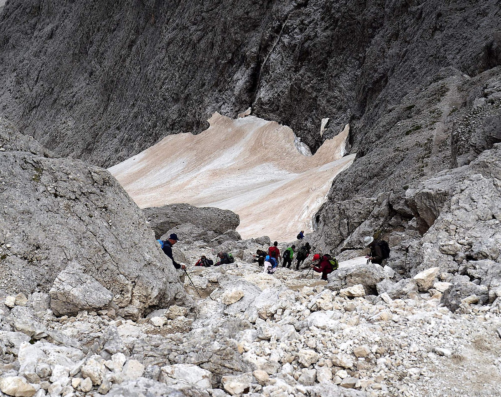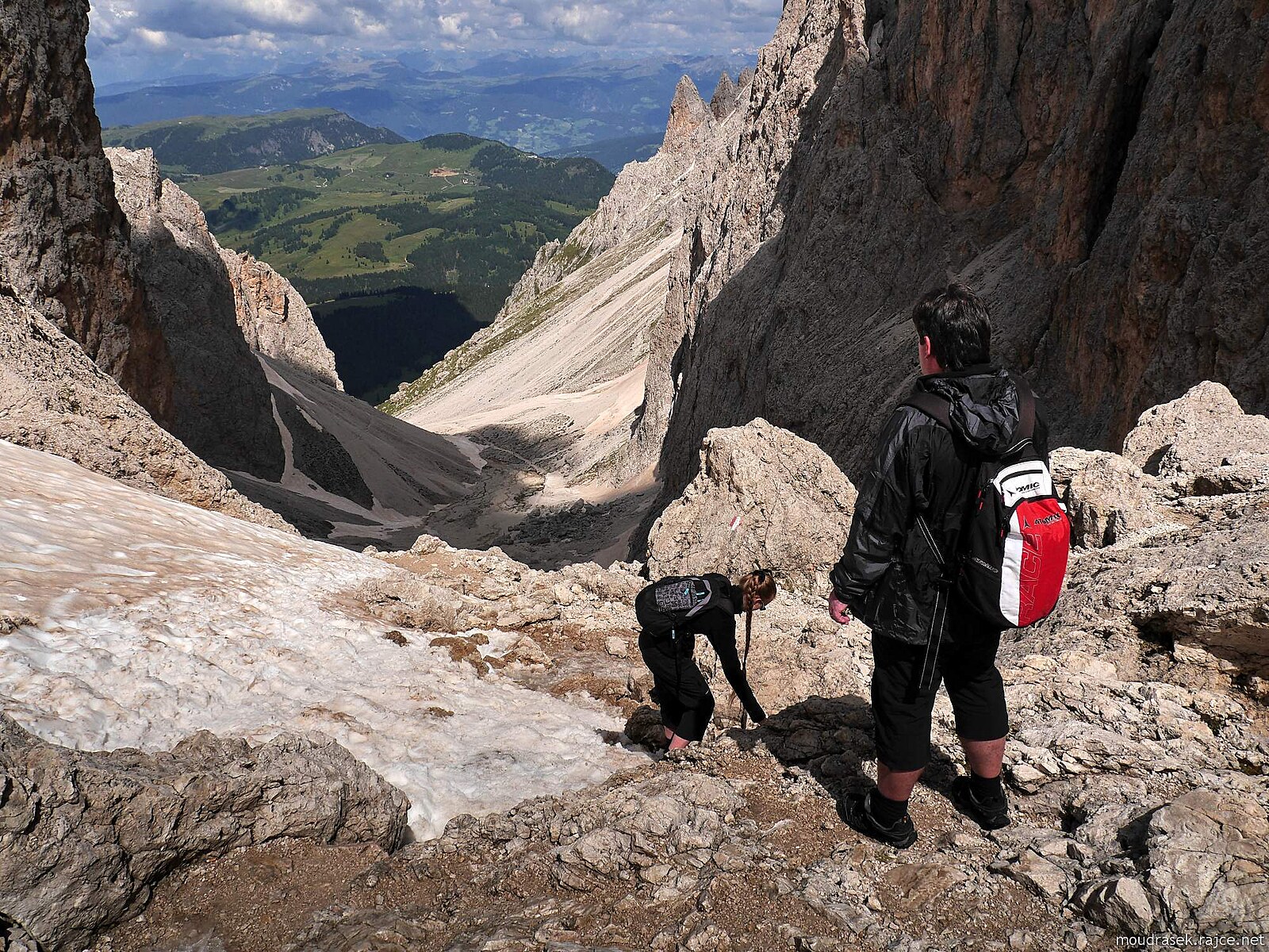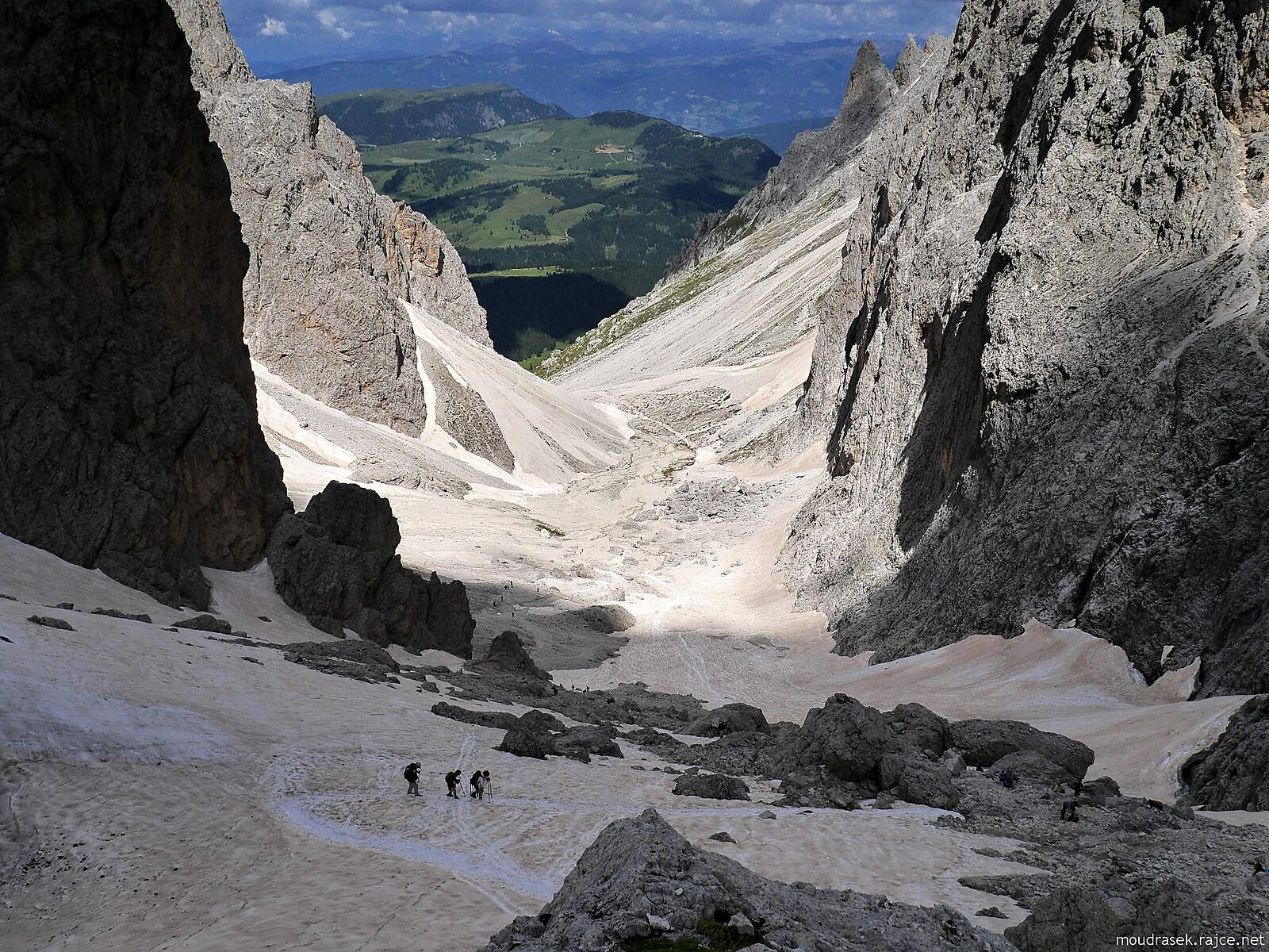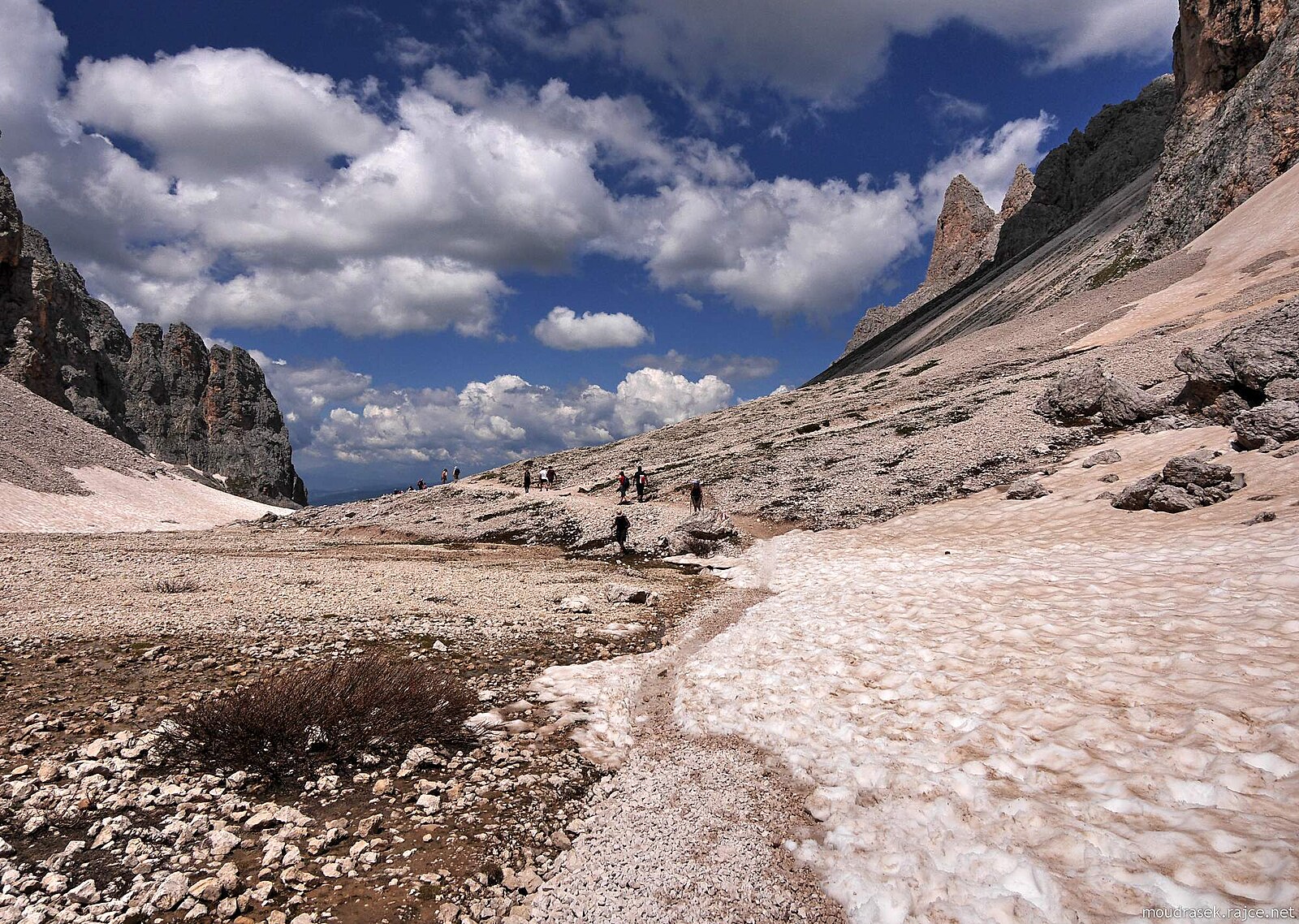 Kar pod Sassolungem/Langkofelm a lidé sestupující stezkou č.525