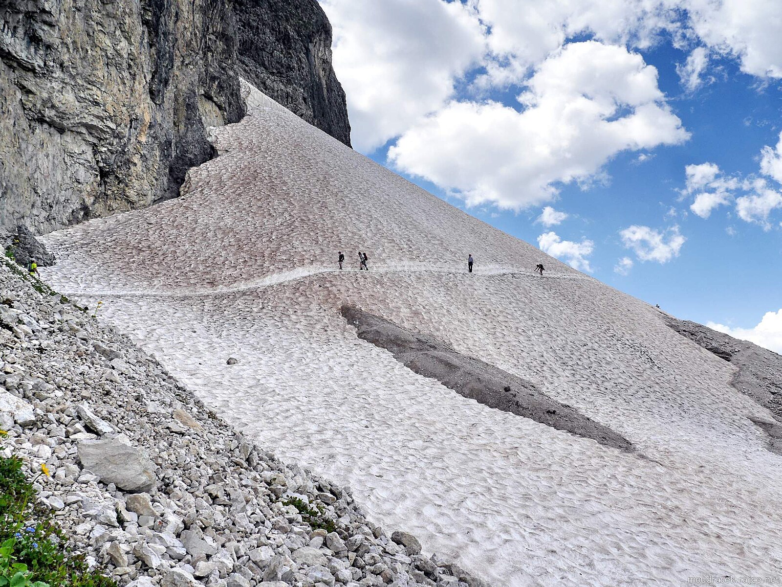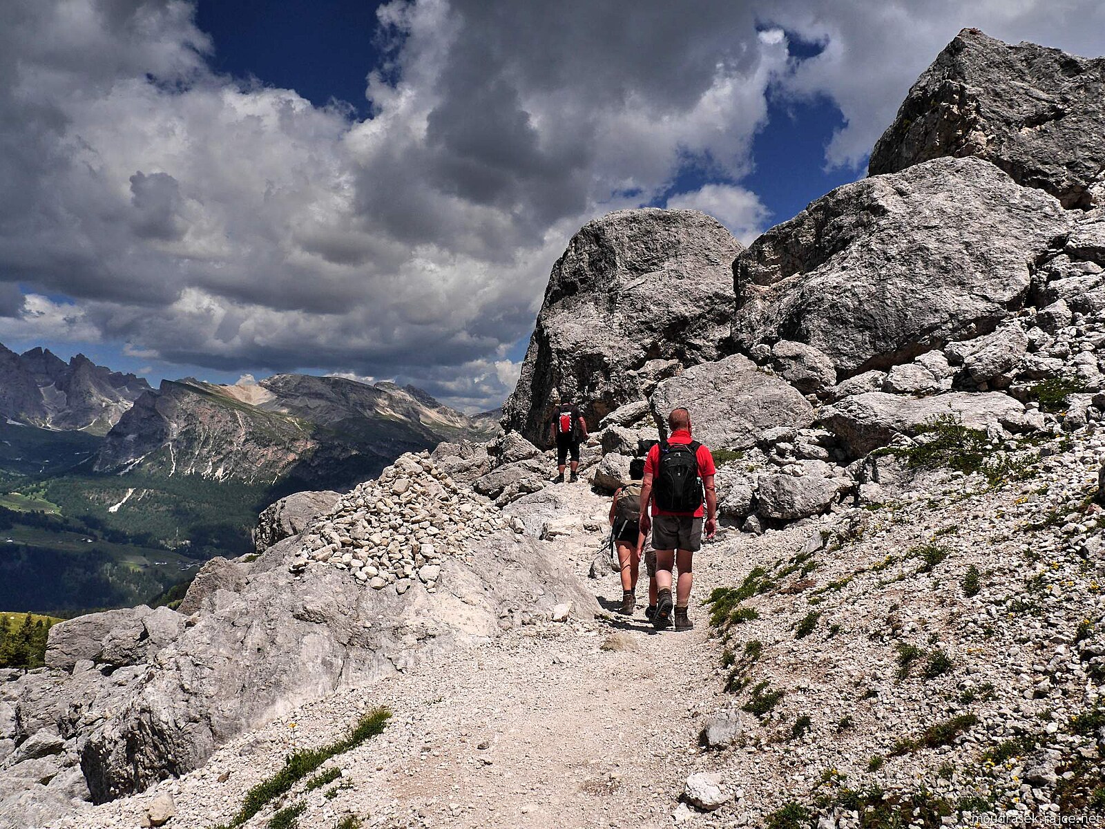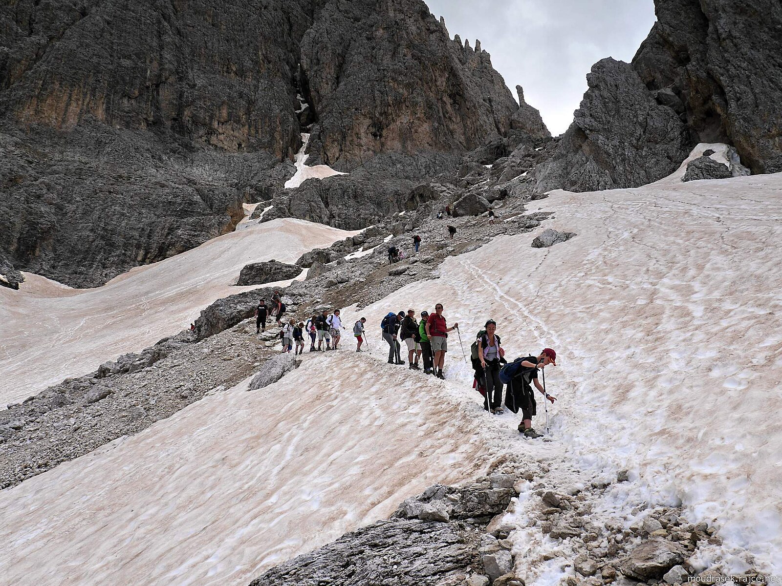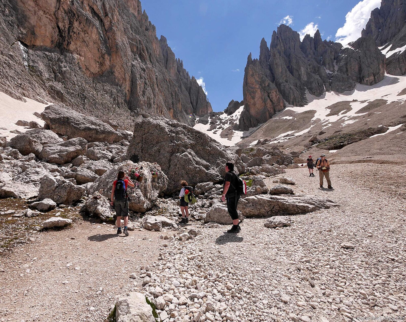 Kar pod Sassolungem/Langkofelm a lidé sestupující stezkou č.525