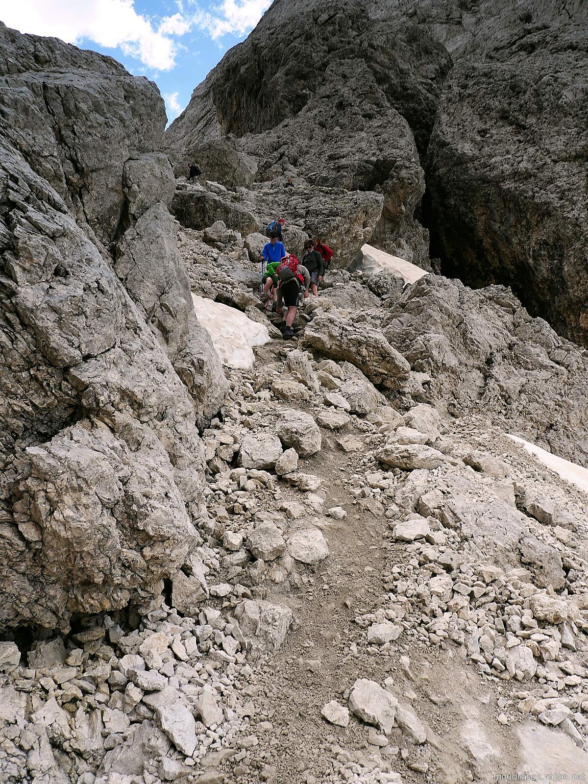 Méně příkrá část stezky č.525 směrem k Rif.Toni Demetz ve Forcella Sassolungo, záběr z lanovky