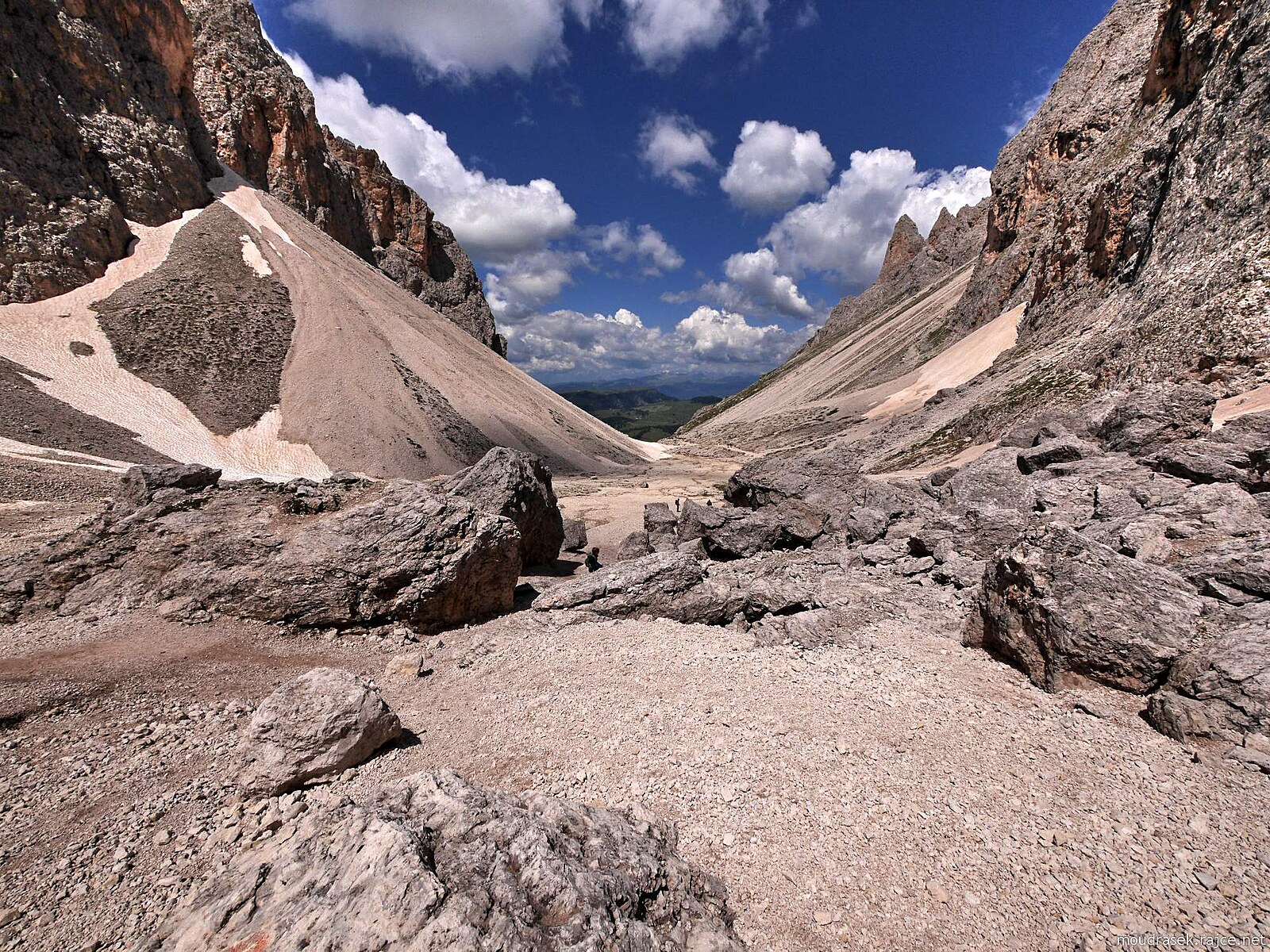 Pohled zpět do ledovcového karu pod Langkofelem/Sassolungem