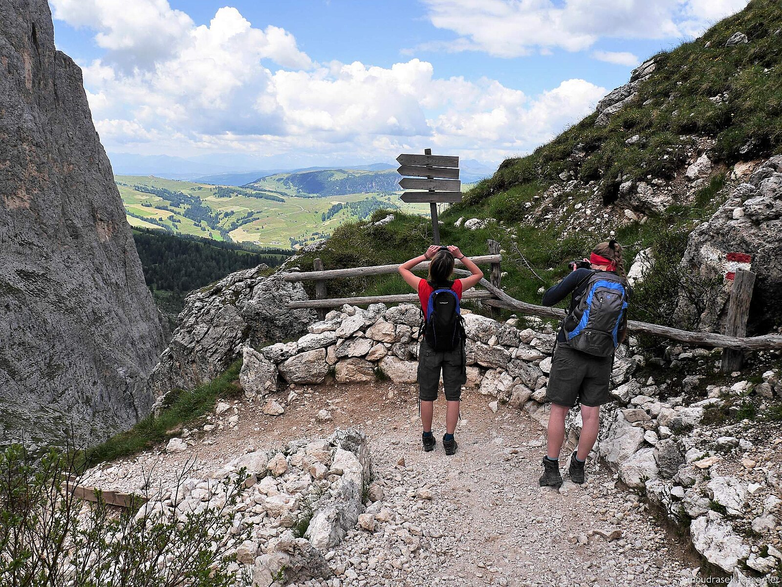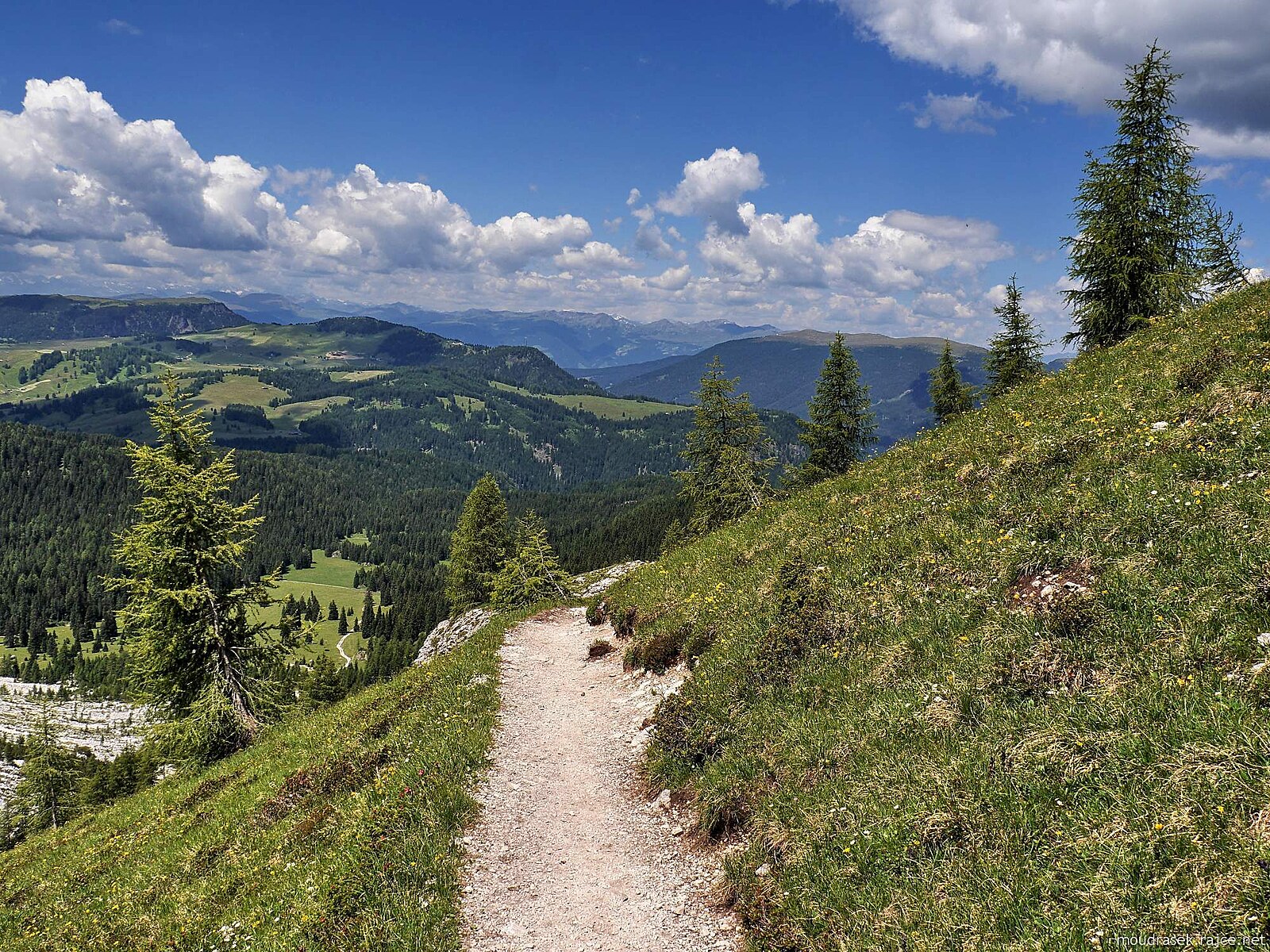 Pěšina č.527 vedoucí k boudě pod Sasso Piatto, v pozadí Schlern/Sciliar