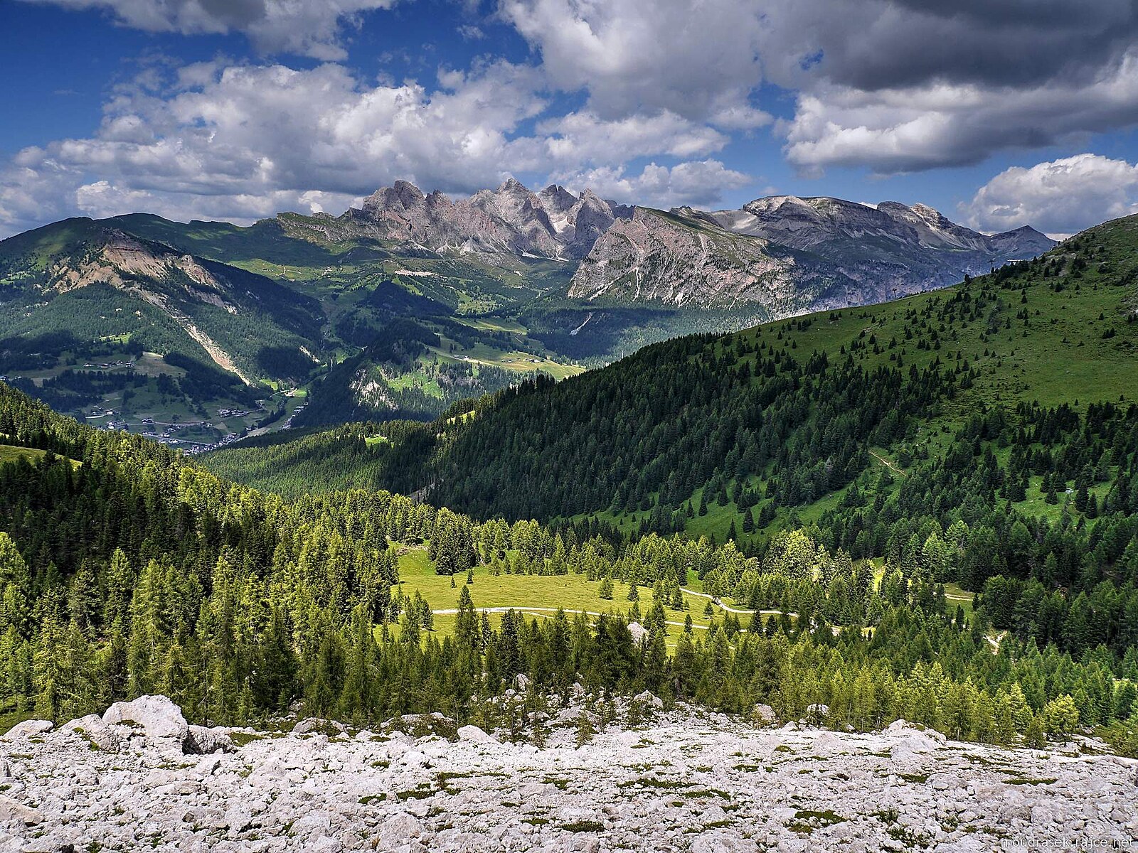 Výhled ze stezky č.526A na Val Gardena a Geisler s vrcholky Fermeda, Sass Rigais a Furcheta, vpředu Monte Stevia, vpravo na obzoru Puez