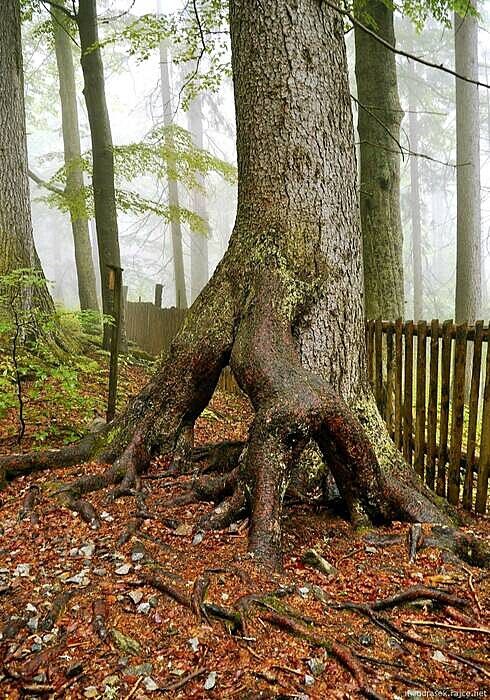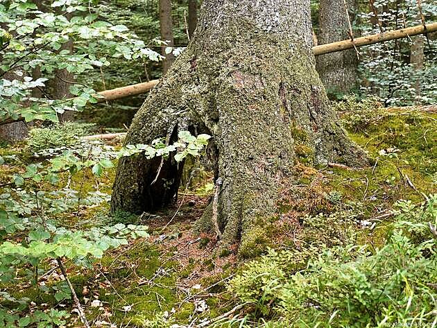 Zbytky 350 let starého Vidlicového smrku (pod stříškou u jezírka)