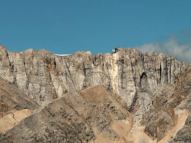 Při pohledu z vrcholu na sever nelze přehlédnout masiv Marmolady. Kromě stanice na Punta Rocca (3 269 m n.m.) je vidět hrana ledovce, včetně lidí, kteří po něm právě pobíhají.