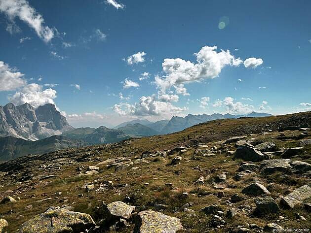 Na vzdáleném obzoru se rýsují severovýchodní Dolomity, např. Sella, Tofana s Lagazuoi (http://martinamoudra.blog.idnes.cz/c/246479/DOLOMITY-Vyhledy-z-Lagazuoi-Piccolo.html), Cristallo (http://martinamoudra.blog.idnes.cz/c/252675/Dolomity-Monte-Cristallo-foto-video.html) a Pelmo.