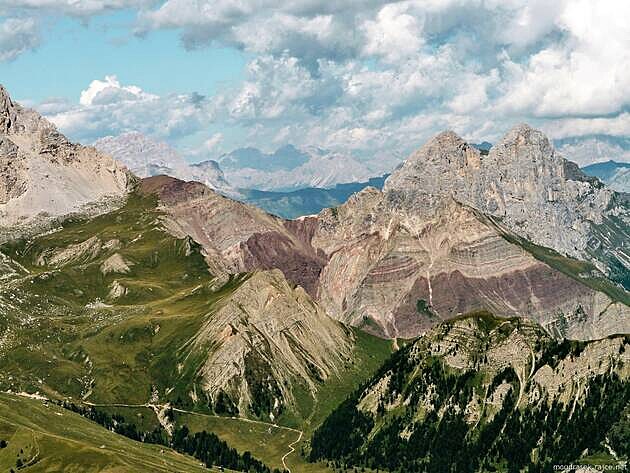 Vrátíme-li se pohledem zpět k impozantní Marmoladě (sever), vpravo pod ní si nelze nevšimnout velmi zajímavých a neobvykle zbarvených obnažených vrstev svědčících o dramatickém vrásnění zdejší krajiny.