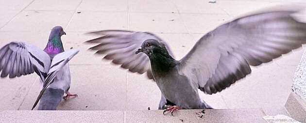 | Vzájemné dvoření holubů a jejich půtky vznikající při boji o zrno byly zpočátku zábavné, ale jak opeřenců přibývalo, výjevy na našem balkóně začínaly nápadně připomínat scény z jistého Hitchcockova hororu. | |