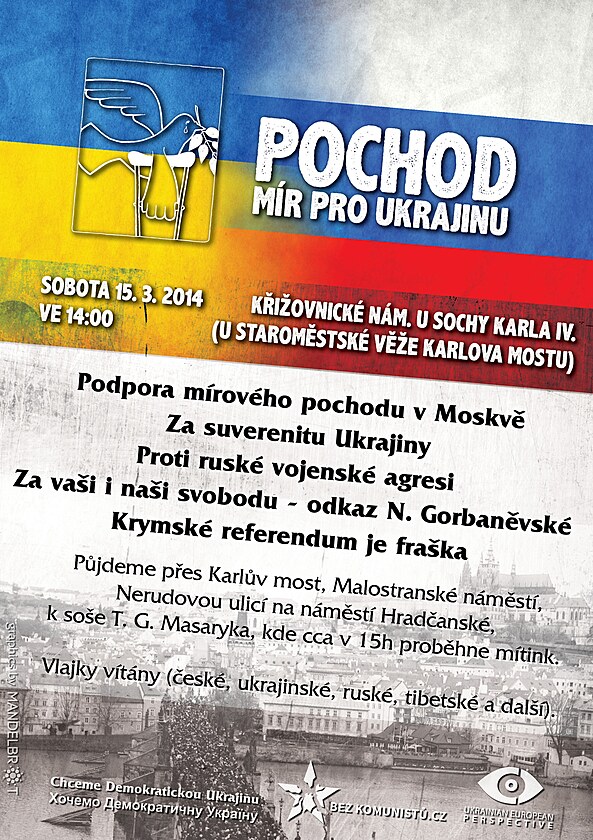 KDY?: Sobota 15. 3. 2014 ve 14:00 KDE?: Křižovnické nám. u sochy Karla IV. (u Staroměstské věže Karlova mostu)CO?: Půjdeme přes Karlův most, Malostranské náměstí, Nerudovou ulicí na náměstí Hradčanské, k soše T. G. Masaryka, kde v cca 15h proběhne mítink. S SEBOU: Vlajky vítány (české, ukrajinské, ruské, tibetské a další).POŘADATELÉ: Chceme Demokratickou Ukrajinu - Хочемо Демократичну Україну, Bez komunistů.cz, Ukrajinsko Evropská Perspektiva-------------------------------------------------------------------------BRNO: https://www.facebook.com/events/1546637292228778KARLOVY VARY: https://www.facebook.com/events/713291188710640MOSKVA: https://www.facebook.com/events/807275709299709