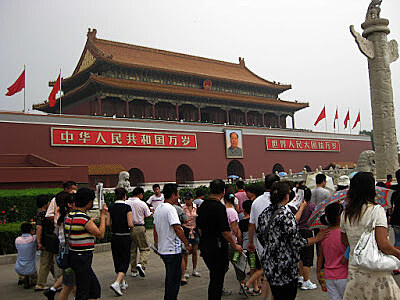 Nejvíc nás totiž zdržela právě brána Nebeského klidu (天安门 Tian'anmen), národní symbol. Právě z ní totiž Mao Ce-tung před 59 lety vyhlašoval Čínskou lidovou republiku. Dnes se k bráně sjíždějí Číňani i z těch nejzapadlejších koutů Číny – a právě ti byli první překážkou na cestě. Někteří z nich totiž z domova nejsou zvyklí na cizince a po příjezdu do Pekingu je Tian'anmen samozřejmě to první, kam vyrazí, a tak prostě musí cizák počítat s tím, že jej bude po cestě zastavovat jeden vedle druhého s žádostí o fotku. Jsou ale milí a usměvaví, tak proč ne – doma pak fotky hrdě ukazují svým blízkým, jak nám vysvětloval pán z Henanu, který si ale myslel, že mu stejně nerozumíme. Na samotnou bránu Nebeského klidu se dá i vylézt (za 15 yüanů) a shlížet tak jako "dědeček Mao" na ohromnou plochu přilehlého náměstí – tedy pokud si odmyslíte budovu Maova mauzolea, kterou náměstí "přeťali" vejpůl a přerušili středovou linii, po které mohl císař z nitra paláce dohlédnout až k hlavní bráně městského opevnění. Jako národní symbol si Číňani bránu i patřičně hlídají, nahoru vás pustí jen s foťákem, všechny ostatní věci si musíte nechat v úschovně a ještě pro sichr projít detektorem kovů. Nahoře si můžete prohlídnout něco z moderních dějin Číny, kynout Číňanům pod branou (kteří vás ale narozdíl od Maa mají na háku) nebo se jen tak usmívat na "agenty" – mladé kluky z ochranky v riflích, bílém tričku a drsných tmavých brýlích. Ale moc se jim to nelíbí – ořvali nás, ať se blbě netlemíme, a ve 12 hodin seřazení vojenským krokem z brány odpochodovali, střídání stráží. Před samotným vstupem do Zakázaného města (muzeum začíná až za branou 午门 Wumen, která je od brány Nebeského klidu třetí v pořadí) nás ještě zdržoval klasický čínský turistický ruch, obohacený o pekingskou specialitu – studenty umění mluvící plynulou angličtinou. Vzpomínám si ještě na vyprávění jednoho kamaráda, který se do Pekingu vypravil sám, vyzbrojen jen znalostí čínských znaků z japonštiny. Právě takovéto "studentky" jej odchytily svou klasickou frází, že studují umění a angličtinu, zrovna končí školu a mají nachystanou závěrečnou výstavku. Zavedly jej kamsi bokem, kde jej chudáka obestoupily v takovém množství, že mu nezbylo, než si jeden z těch šíleně předražených obrazů koupit. Když jej konečně pustily, o pár metrů dál viděl na chlup stejný obraz s poloviční cenou na štítku. A tu mohl smlouvat :) Po zaplacení vstupného (60 yüanů, s čínskou studentskou průkazkou dokonce jenom za 20, což je na památku takového rozsahu a významu opravdu pakatel) nás ale už nic nerušilo v poklidném procházení celého ohromujícího areálu, který dal detailně nahlédnout do života na císařském dvoře. Dalších 10 yüanů se pak platí za vstup do pokladnice, tam nás už ale bohužel nepustili. Došli jsme totiž pozdě. Císařská pokladnice se zavírá ve čtyři hodiny odpoledne – a my jsme se zpozdili jen o dvě minuty. Paní z pokladny už byla pryč a vrátný byl neúprosný. Snažil jsem se jej po čínsku ukecat, zahrát mu na city, že přijeli kamarádi z daleka a zítra se vracejí domů a že tu pokladnici moc moc moc chtějí vidět a že už nemají kdy. Vrátný by nás tam aj pustil, ale přes kamerový systém prostě nejede vlak, nařízení je nařízení. Z lehce rozmrzelé nálady nás po východu ze Zakázaného města vytrhla až neznámá Číňanka. Přiklusala k nám, když jsme se chystali sejít zpátky do metra. Už zdálky na nás volala "Hello!" a když doklusala až k nám, mile se usmála, zahlásila "Welcome to Beijing!"... a zase šla. Čekal jsem další studentku umění nebo že na nás bude chtít dělat pokusy se svou angličtinou, ale vůbec nic. Přivítala nás v Pekingu a odešla. A to na nás udělalo opravdu dojem. Přemýšlel jsem totiž, co by asi tak kdo řekl například v Ostravě skupince turistů z Číny :)