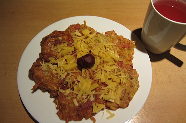 MICHAL: Po 24 hodinách válení se v posteli cítím, že v ní už nevydržím snad ani minutu. Kromě toho mám obstojný hlad. S předtuchou zbytečné vydané energie jdu vykonat inspekci ledničky. Tušení mě nezklamalo, tady by doktorka Cajthamlová zaplakala nad výdělkem - moc by toho z ní do koše nevyhodila. Kde nic není, ani ona nebere.. Nakonec dávám dohromady 5 mini brambor, vajíčko, koření, mouku, a slaninu - sláva bude bramborák. A byl, fotka vpravo je toho důkazem ... jenže mě mezitím přešel hlad. Co mohu dělat dál? Žehlit rozhodně nebudu, třeba by to byla zbytečná práce, fakt se necítím nejlíp! V tom si vzpomenu na Janu a její tip. Tak nevím ... jestli mě včera nenapadlá vtipná pointa, tak dnes mě nenapadá vůbec žádná. Jenže sliby se mají plnit!