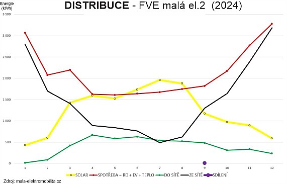 Graf DISTRIBUCE energií. Kde a kolik jsme brali elektrické energie, kolik jsme poslali zpět do distribuční sítě a na sdílení.