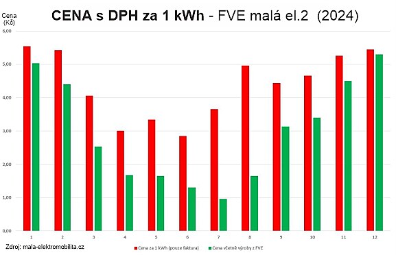 Druhá cena je cena z faktury (mínus cena za elektřinu dodanou do sítě (přetoky)), ale podělená celkovou spotřebou domu. Tedy celkově odebrané množství energie z faktury + vyrobená energie z FVE, kterou jsme v RD spotřebovali. Náklady na energii vyrobenou z naší FVE počítáme za nulu – jako že ji máme zdarma. I když s tím není jednoduché souhlasit, elektrárna je již prostě zaplacená.