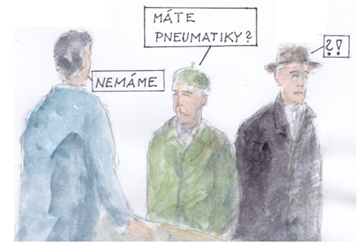 Naštěstí je tu pan Bažant a ten umí pneumatiky sehnat. A nejen pneumatiky. Pan Bažant je velmi malé postavy, ale je to člověk – aspoň jak říká on – velkých kontaktů. A bez kontaktů nejde, jak známo, nic.