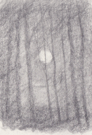Průrvou v korunách stromů proniká měsíční světlo až k přeraženému stromu.
