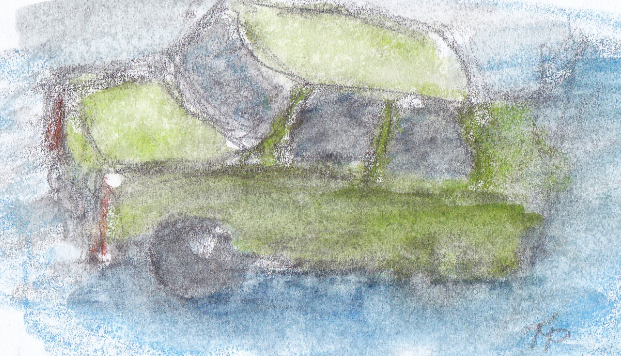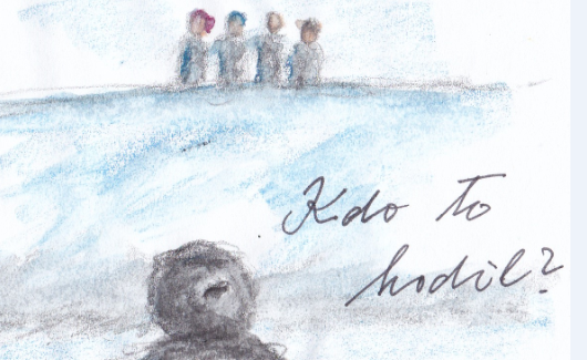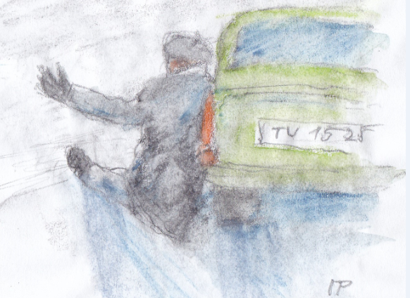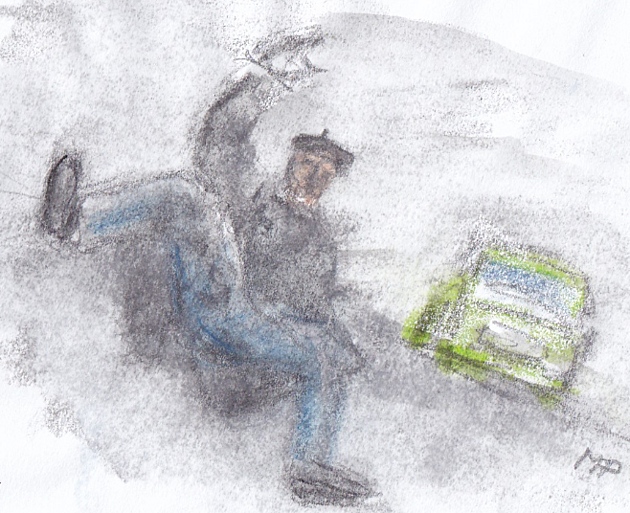 Kolem silnice je vysokánská hradba sněhu. Já, Zdeněk, Arnošt a Olda jsme úplně nahoře a hledáme „sklíčka“, což jsou takové malé kousky ledu nejrůznějších tvarů. Pak začneme házet sněhové koule do stromu na druhé straně. Já ani nevím, jestli to byla náhoda nebo jsem to udělal schválně, prostě jsem trefil auto, které zrovna jelo po silnici, dole pod námi. Je to Trabant.